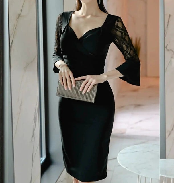 着用するだけでフェミニンな雰囲気が漂うスクエアカラーエレガントレーススリーブスリムミドルドレス。