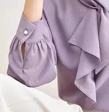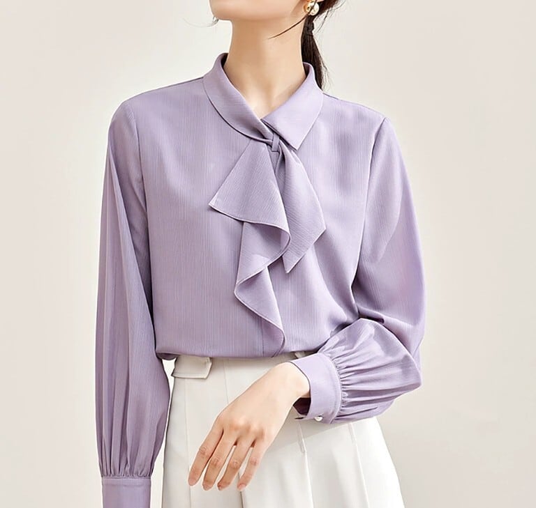 着用するだけで上品でエレガントな雰囲気が漂うラッフルカラーエレガントスリムシフォンシャツ。