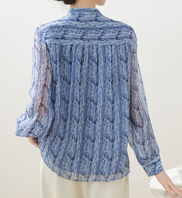 Collarless elegant floral chiffon blouse