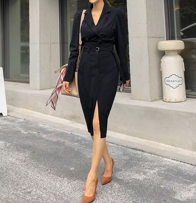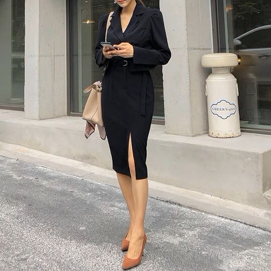 着用するだけでエレガントでフェミニンな雰囲気が漂うスーツカラーエレガントダブルブレストストラップドレスセットアップ。