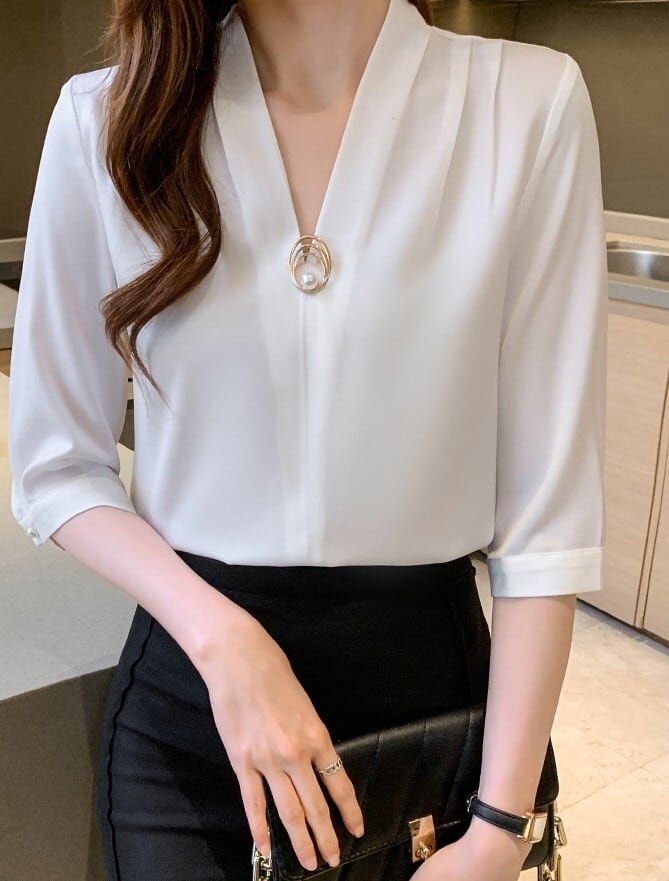 着用するだけで上品でフェミニンな雰囲気が漂うVネックエレガントハーフスリーブチェストパールシャツ。