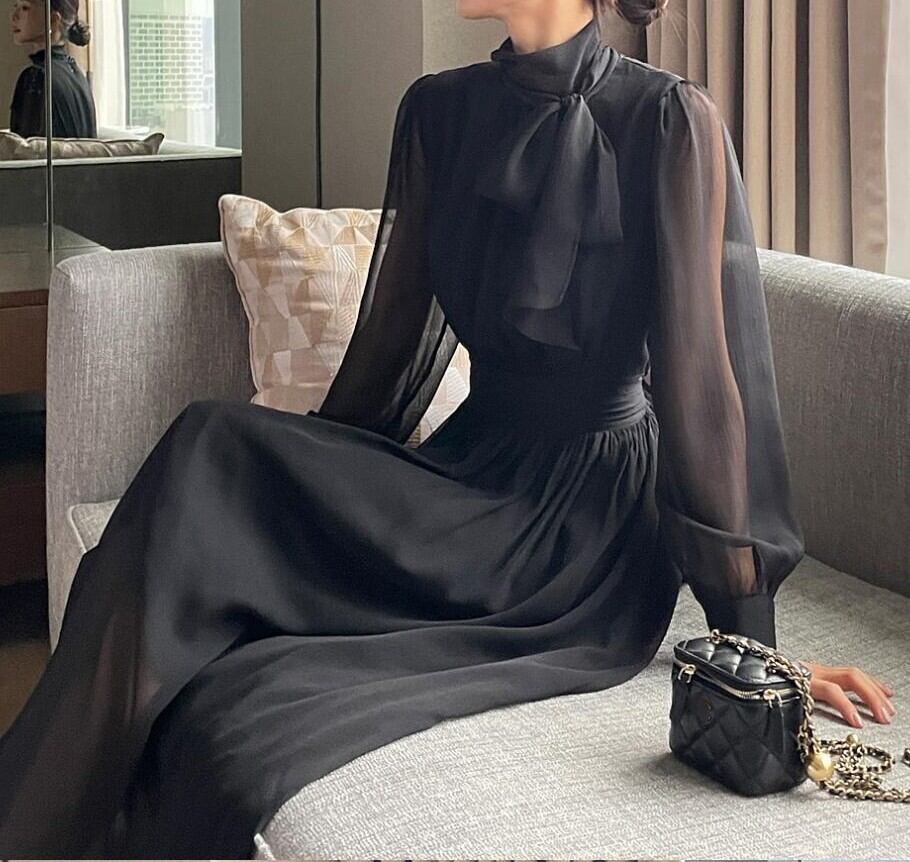 着用するだけで上品でエレガントな雰囲気が漂うチェストタイエレガントバックリボンスイングシフォンドレス。