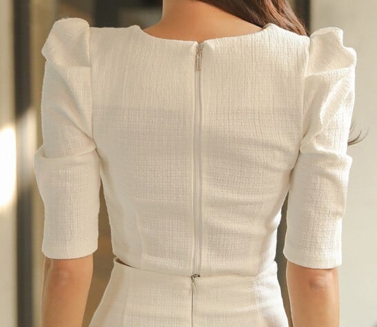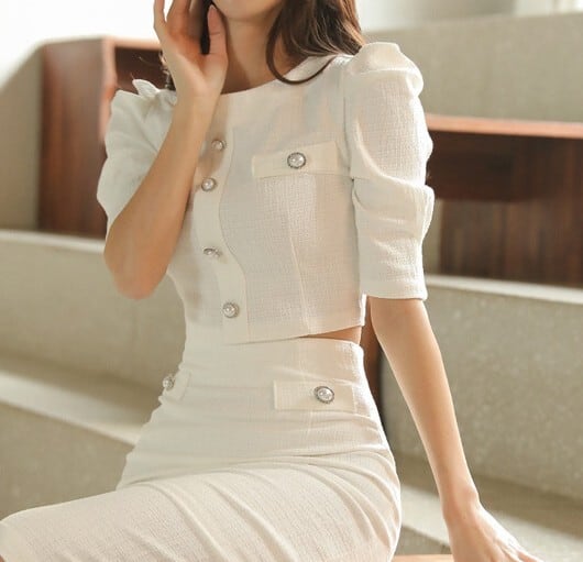 着用するだけでフェミニンな雰囲気が漂うブレストデザインエレガントスリムミドルドレスセットアップ。