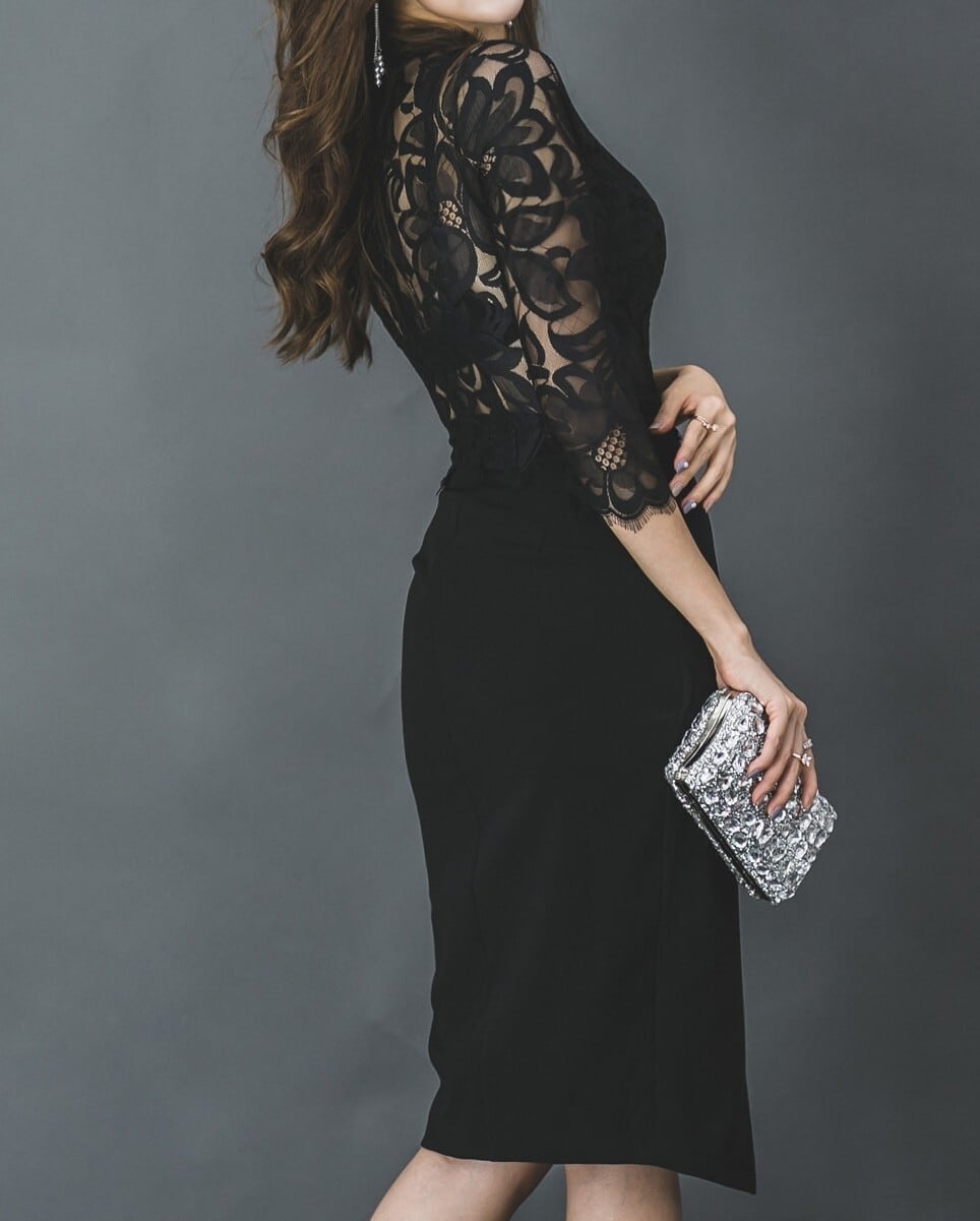 着用するだけでフェミニンな雰囲気が漂うスタンドカラーエレガントレースステッチスリムドレス。