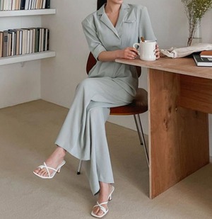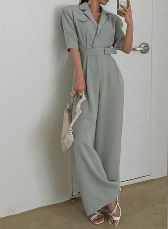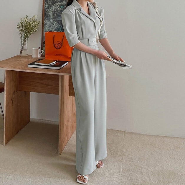 着用するだけでフェミニンな雰囲気が漂うスーツカラーエレガントストラップワイドレッグジャンプスーツ。
