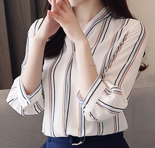 着用するだけで大人可愛い雰囲気が漂うVネックエレガントスリークオータースリーブストライプシフォンシャツ。