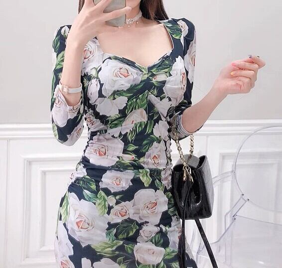 着用するだけでフェミニンな雰囲気が漂うスクエアカラーエレガントスリムフィットフローラルマーメイドドレス。