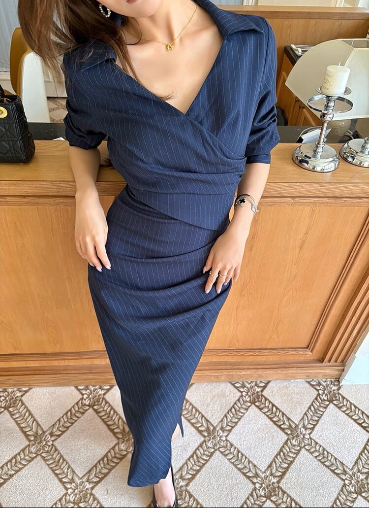 Polo collar elegant waist pleats stripe shirt dress ( 2color )