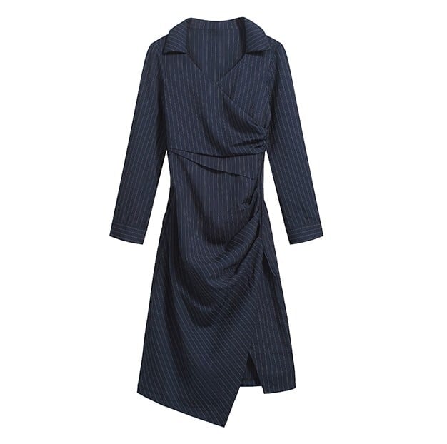着用するだけでフェミニンな雰囲気が漂うポロカラーエレガントウエストプリーツストライプシャツドレス。