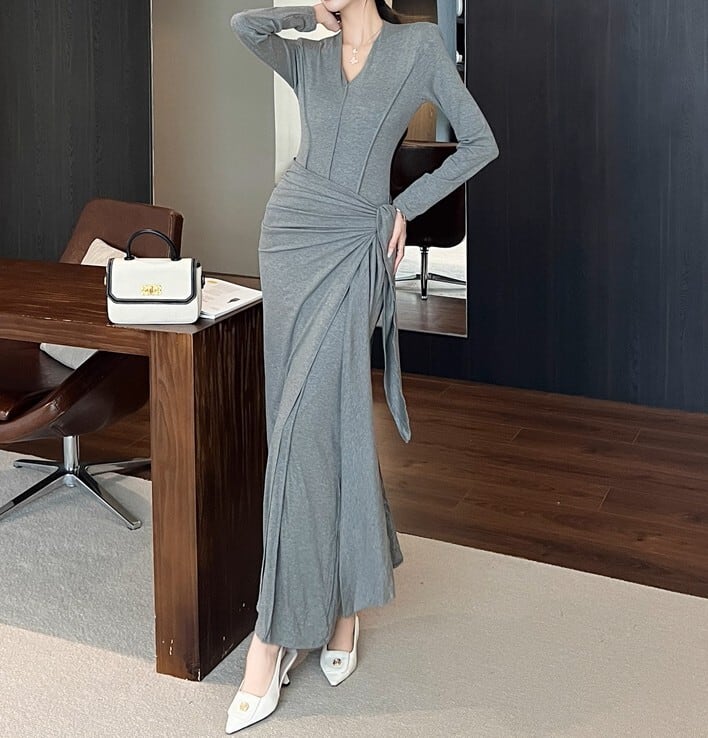 着用するだけでフェミニンな雰囲気が漂うVネックエレガントストラップスリムロングドレス。