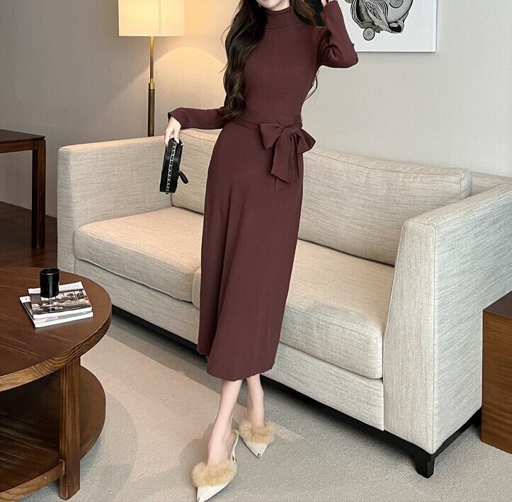 着用するだけでフェミニンな雰囲気が漂うハイカラーエレガントウエストストラップスリムニットドレス。