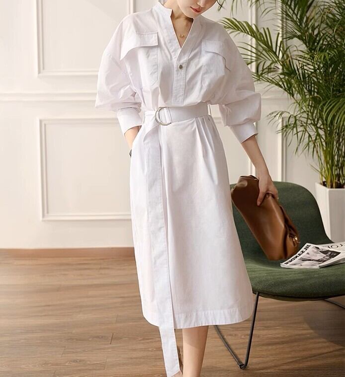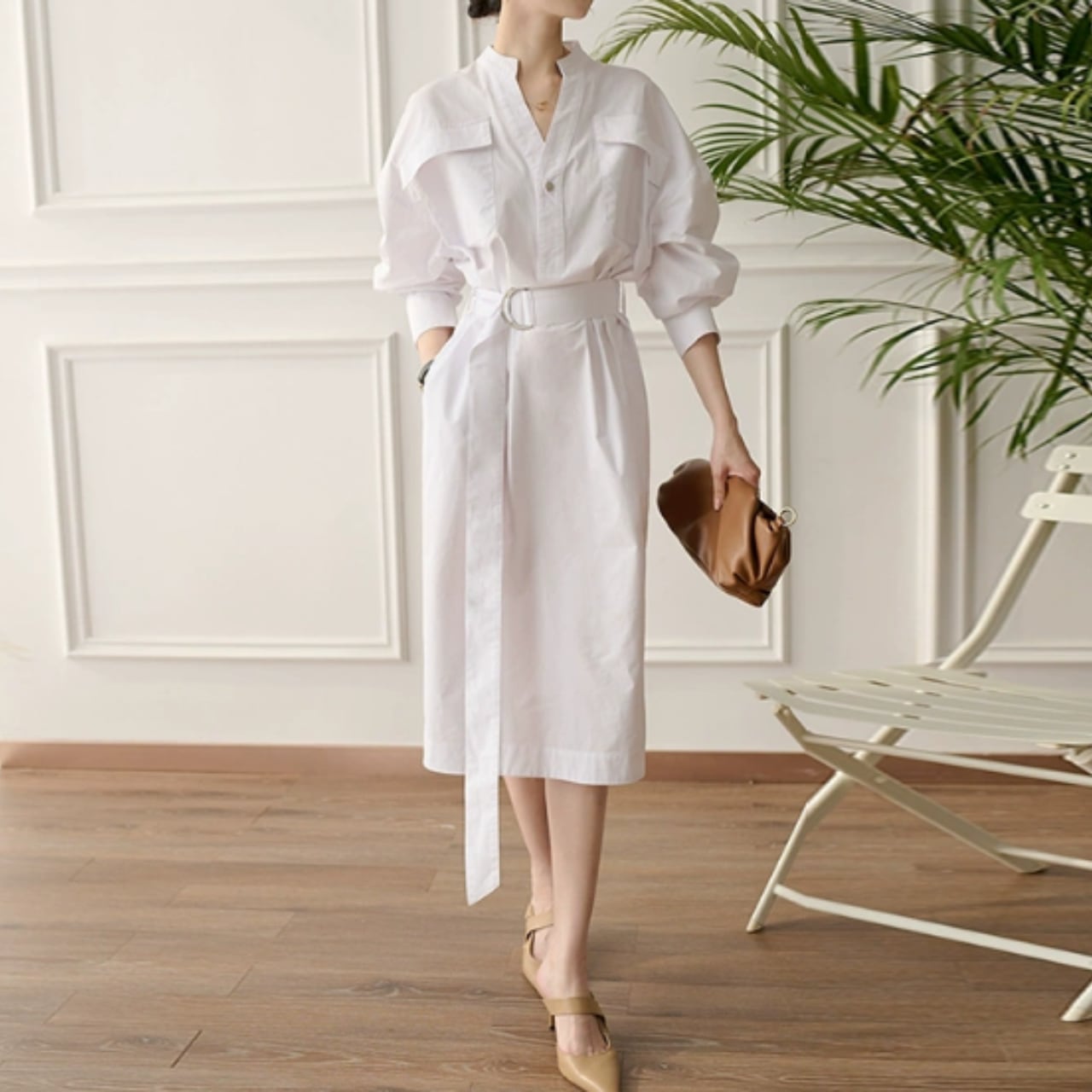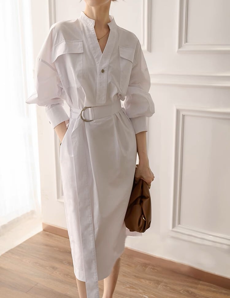 着用するだけでフェミニンな雰囲気が漂うカラーレスエレガントストラップスリムシャツドレス 。