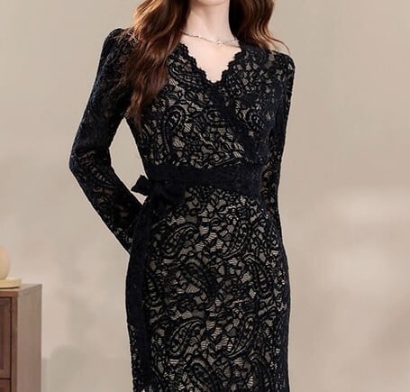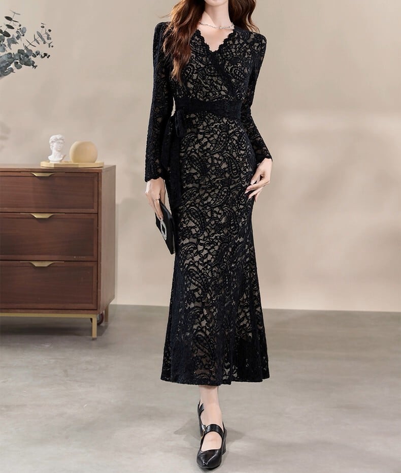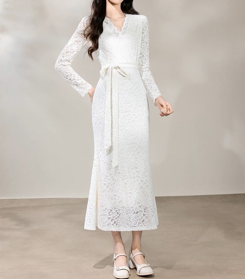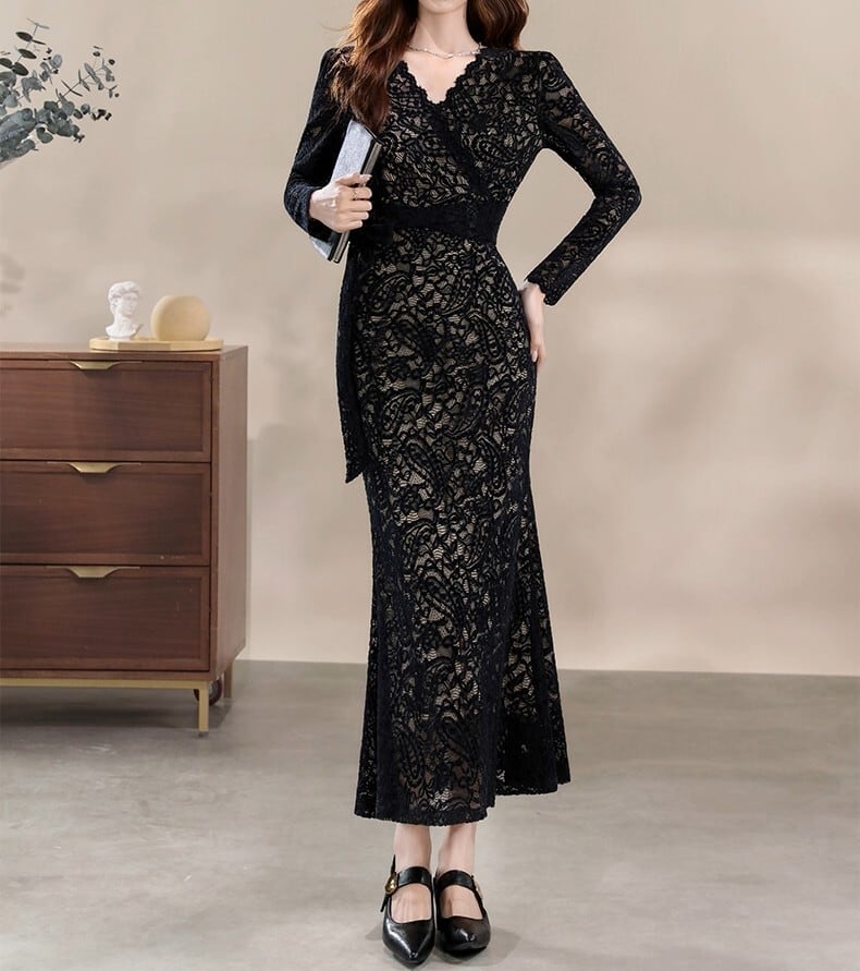 着用するだけでフェミニンな雰囲気が漂うVネックエレガントストラップロングレースドレス。