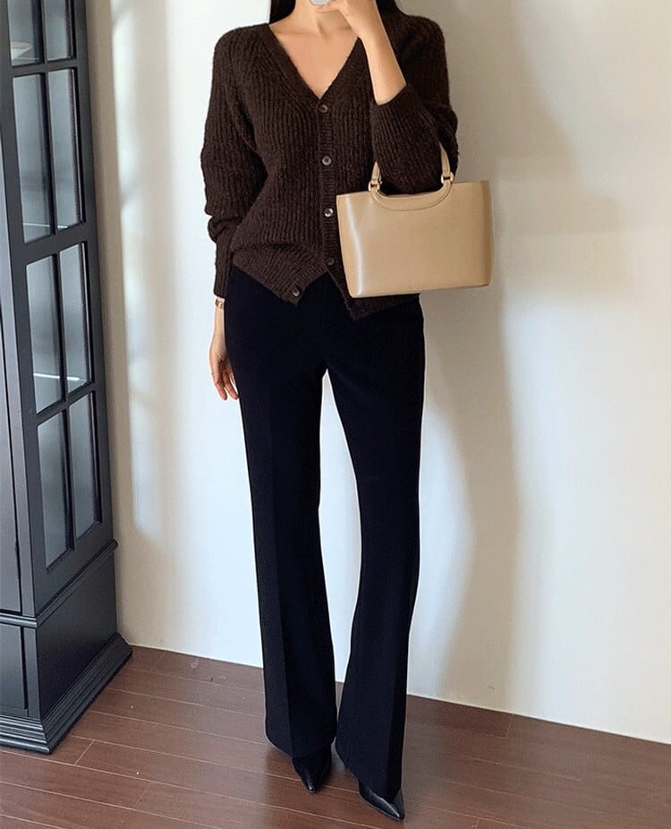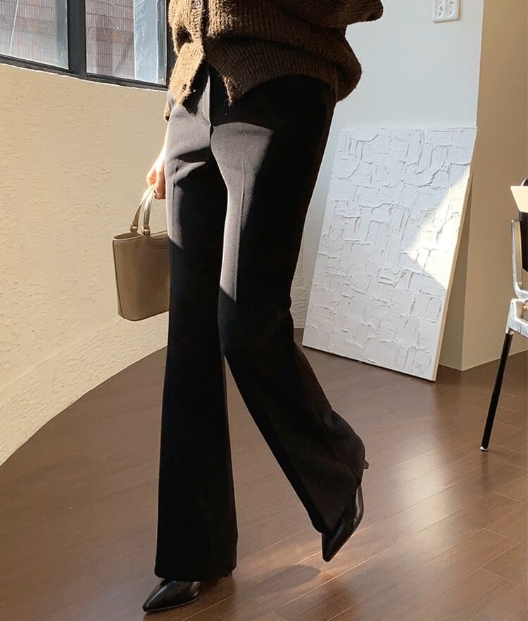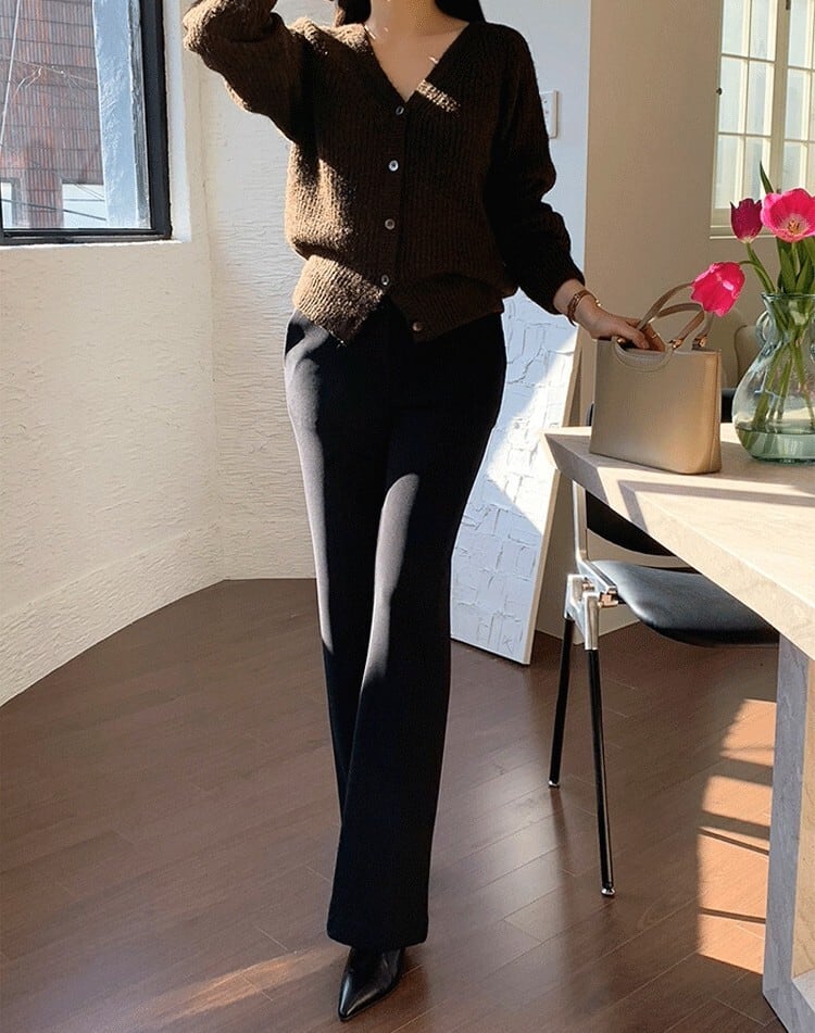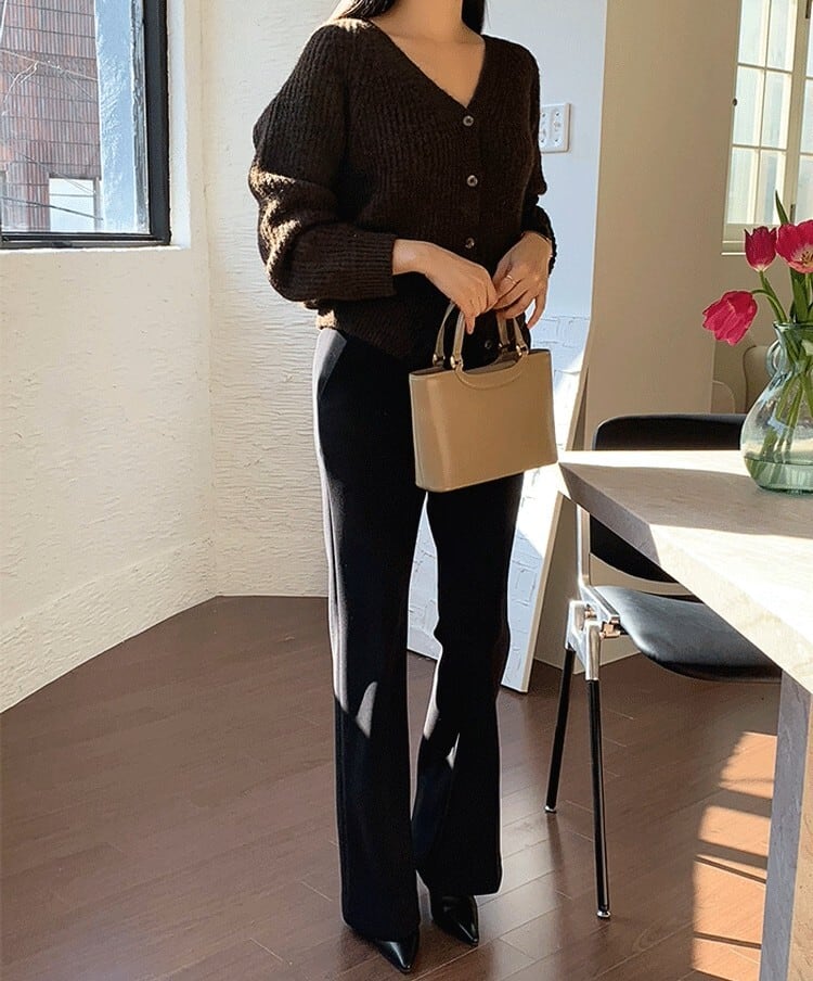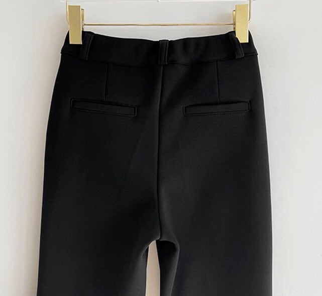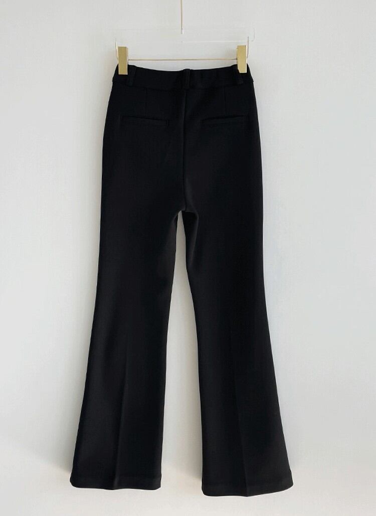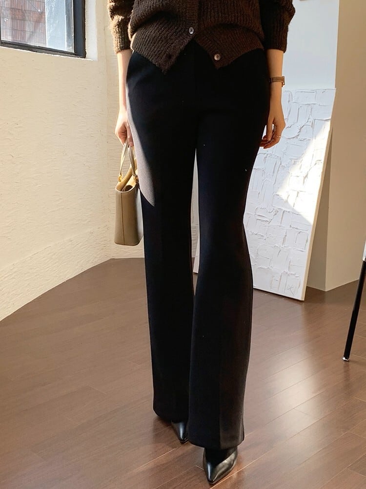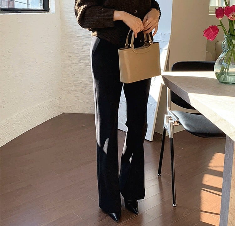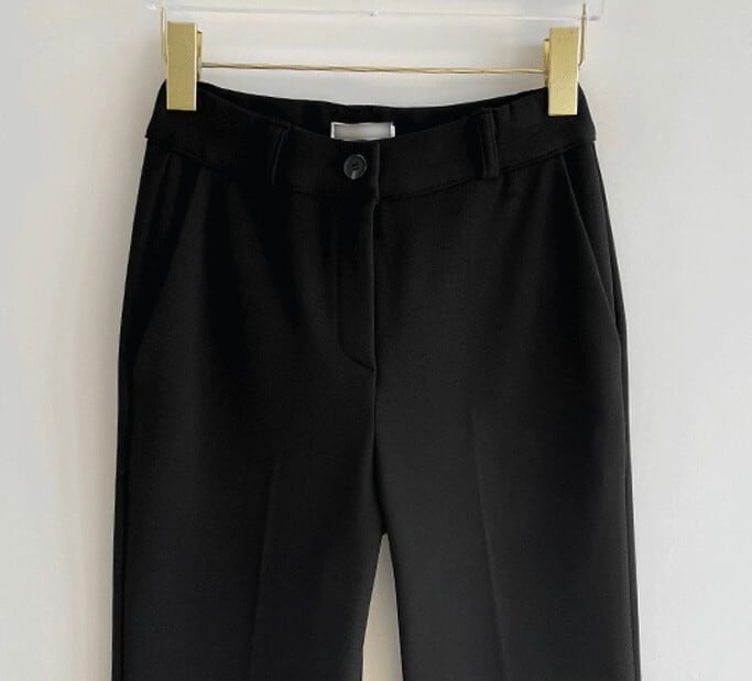 ハイウエスト、ワイドレッグデザインがスタイルを引き締めます。