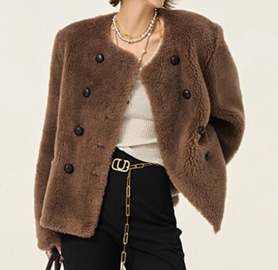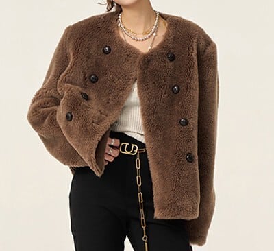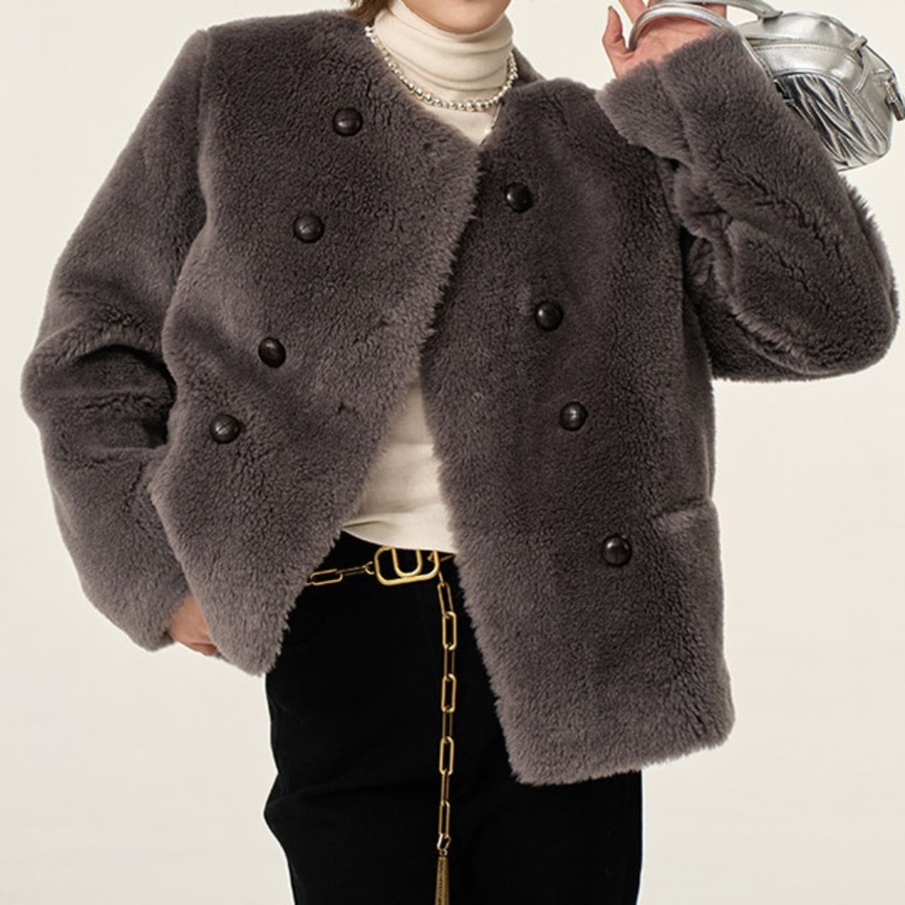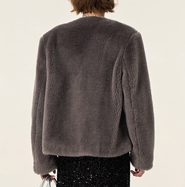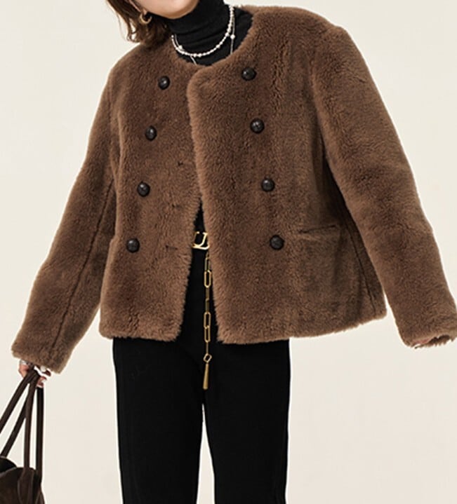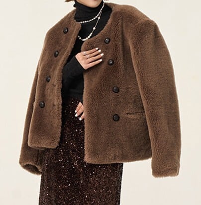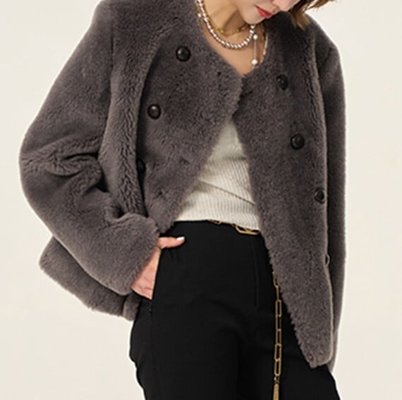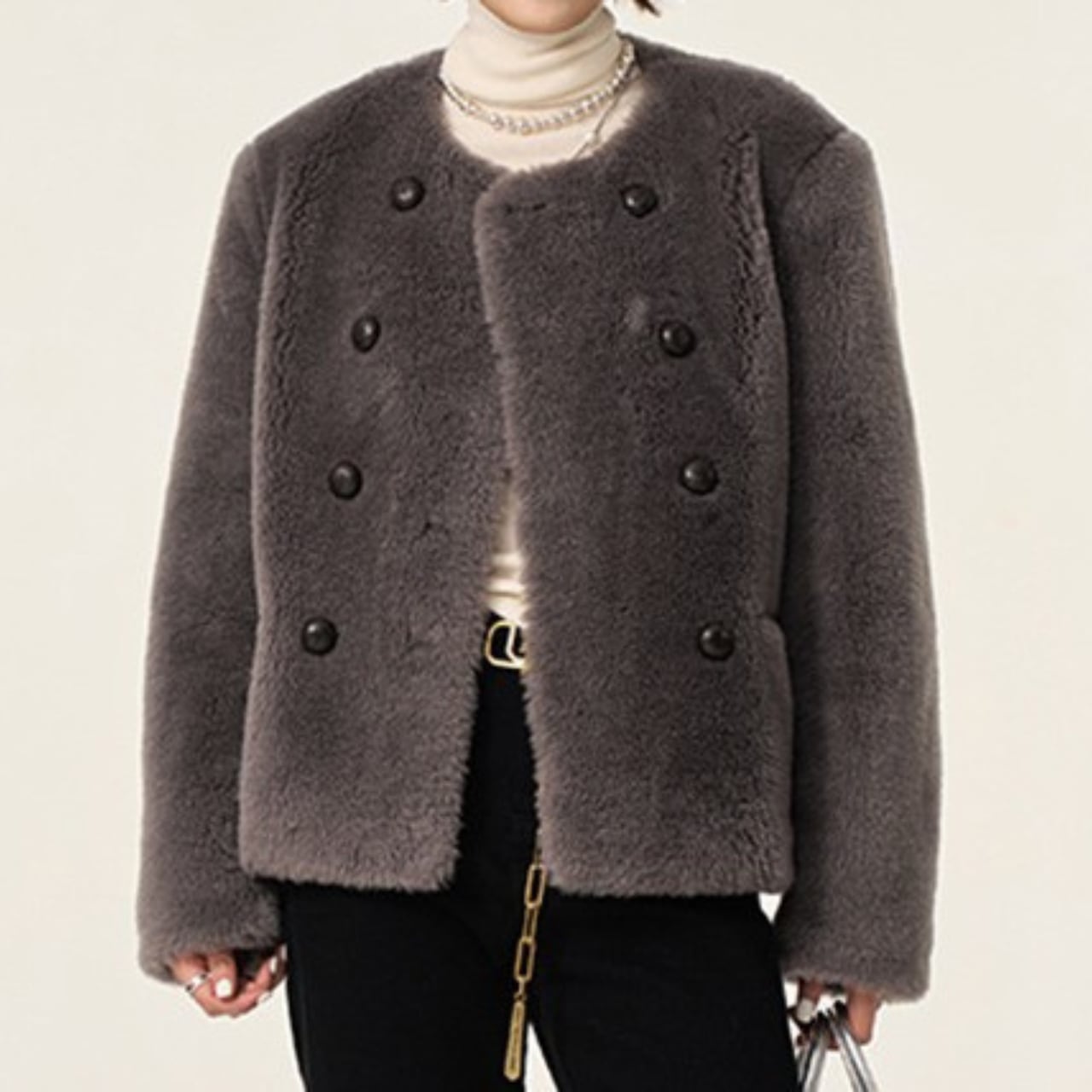 着用するだけでフェミニンな雰囲気が漂うダブルブレストエレガントベルベットファージャケット。