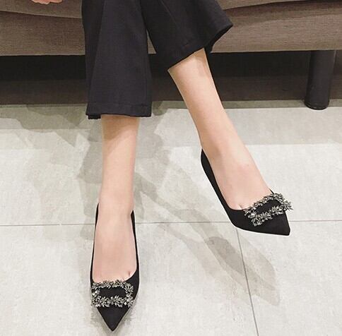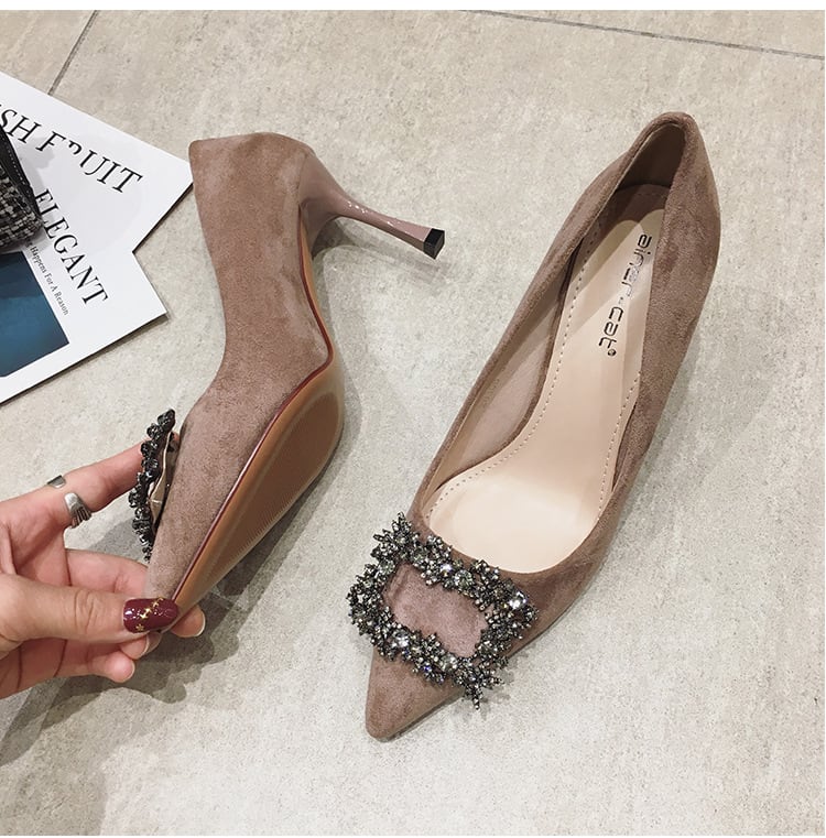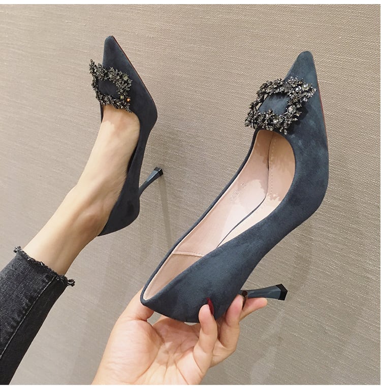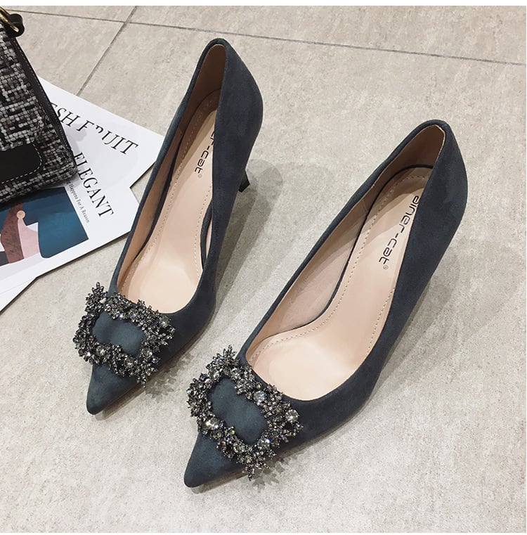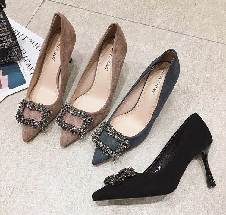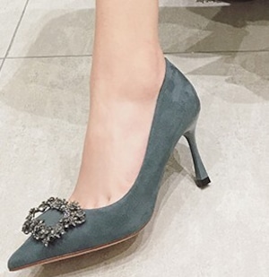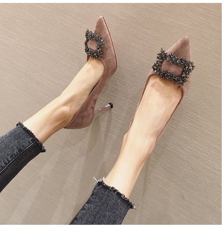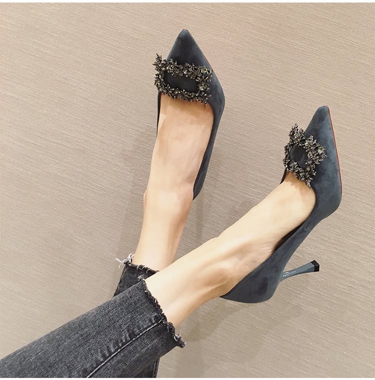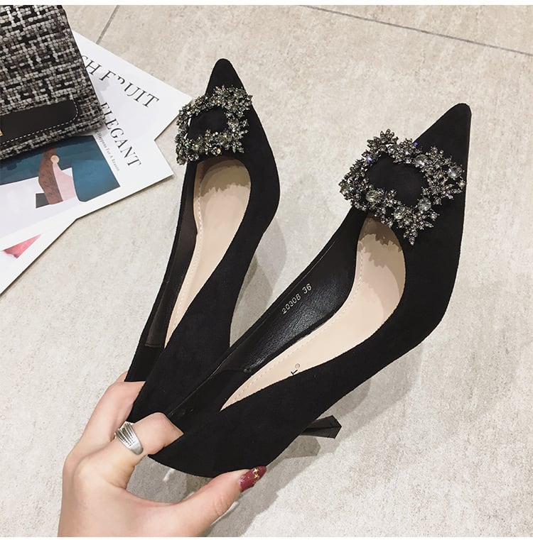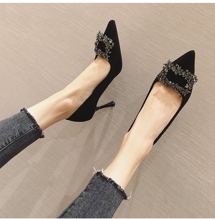 足元をフェミニンに演出するラインストーンバックルエレガントスティレットパンプス。