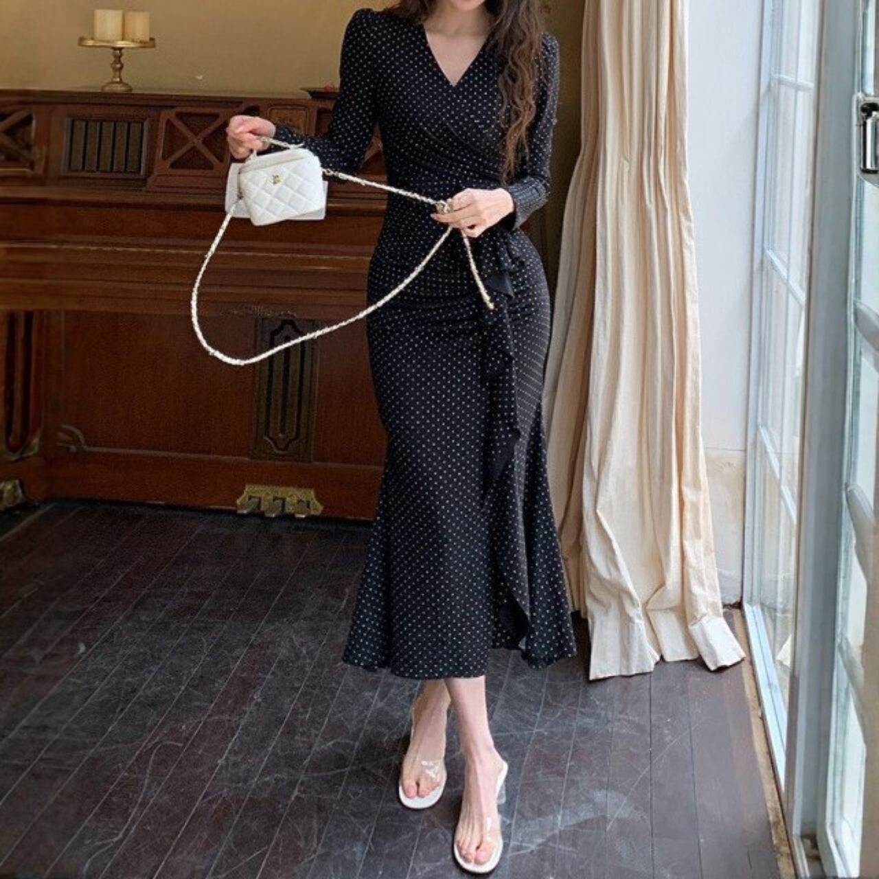 着用するだけでフェミニンな雰囲気が漂うVネックエレガントラッフルステッチスイングロングドレス。