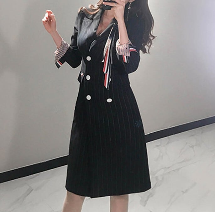 羽織るだけでフェミニンな雰囲気が漂うダブルブレストエレガントストライプミドルスリムコート。