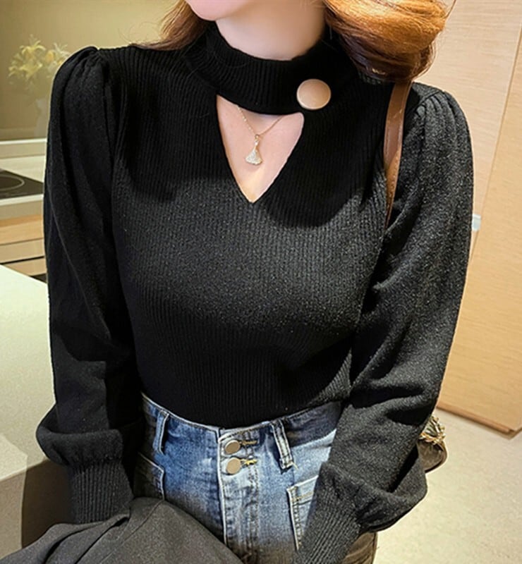 着用するだけ大人可愛い雰囲気が漂うハーフハイカラーエレガントスモールVネックスリムニット。