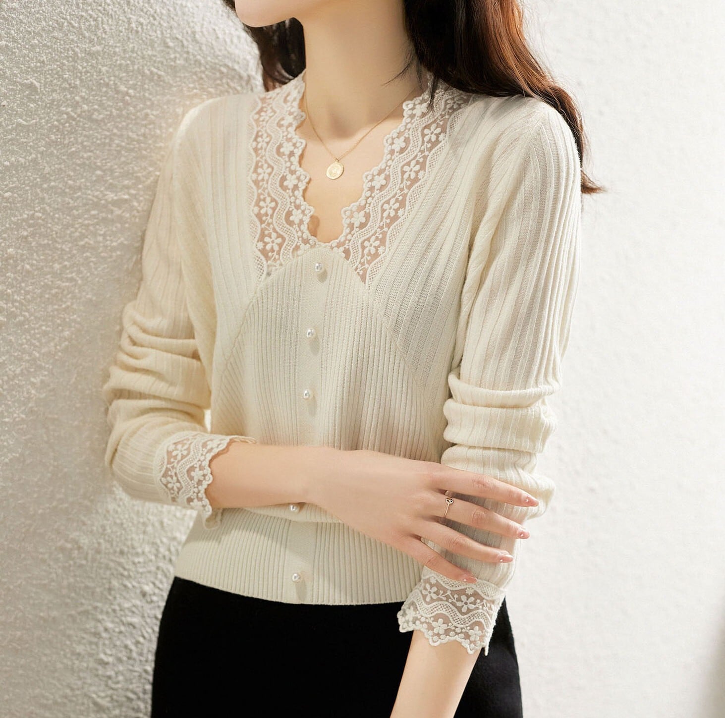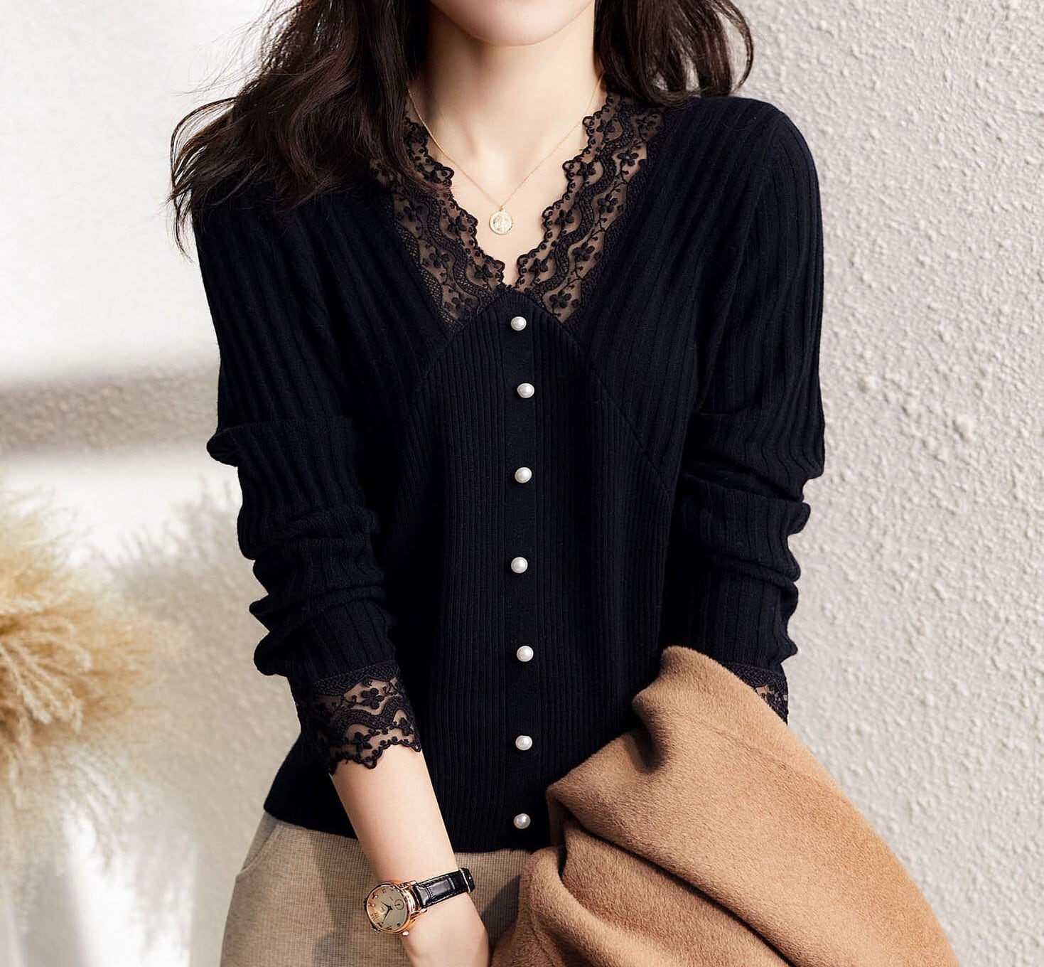 着用するだけでエレガントな雰囲気が漂うVネックエレガントレースステッチスリムニット。