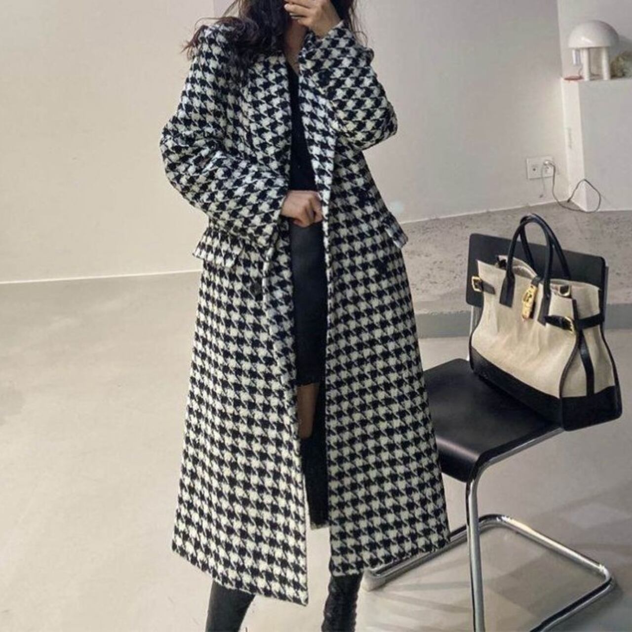Suit collar elegant double breast houndstooth long coat