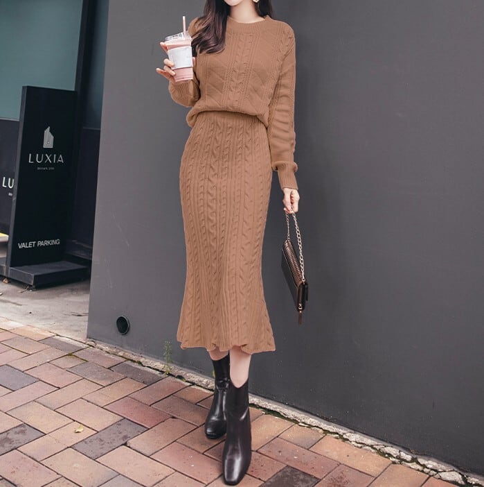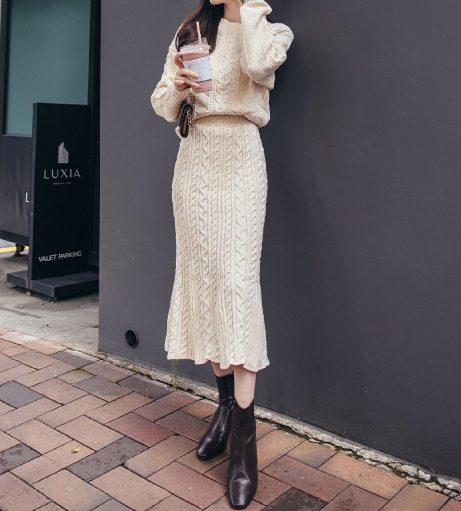 ラウンドネックスリムケーブルニットとハイウエストマーメイドニットスカートのセット商品です。