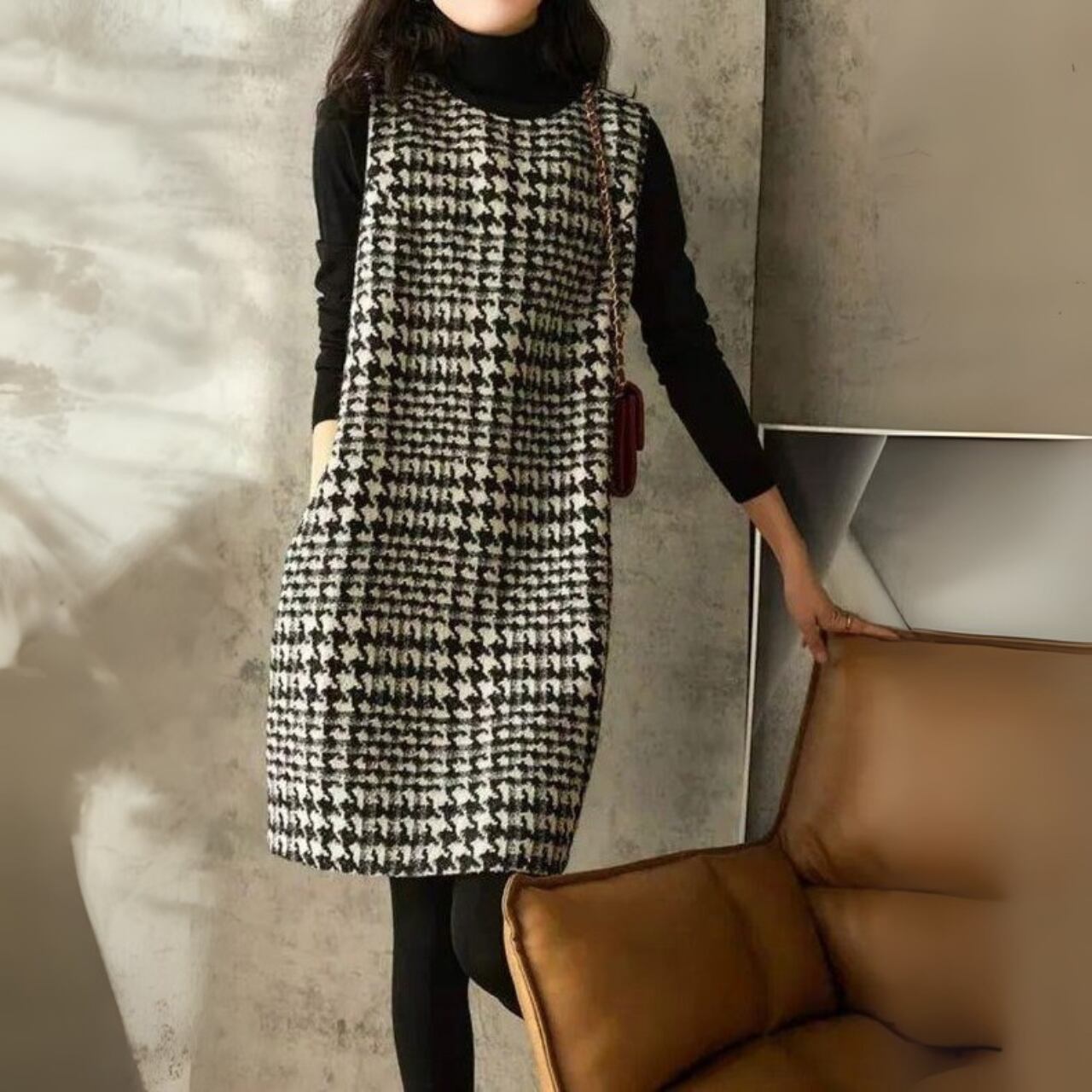 着用するだけでフェミニンな雰囲気が漂うラウンドネックエレガント千鳥格子スリムドレス 。