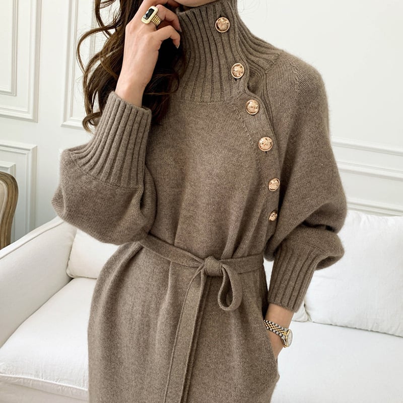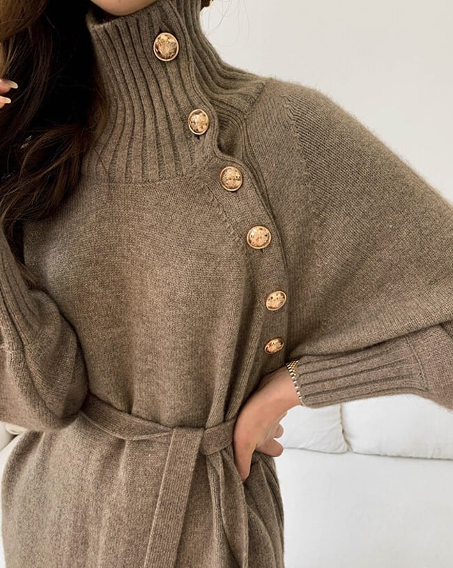 着用するだけでフェミニンな雰囲気が漂うハイネックエレガントシングルブレストストラップロングニットドレス。