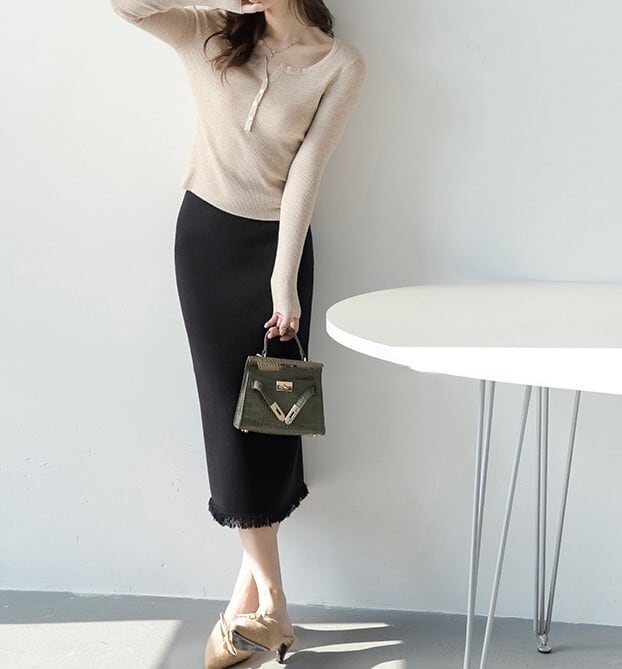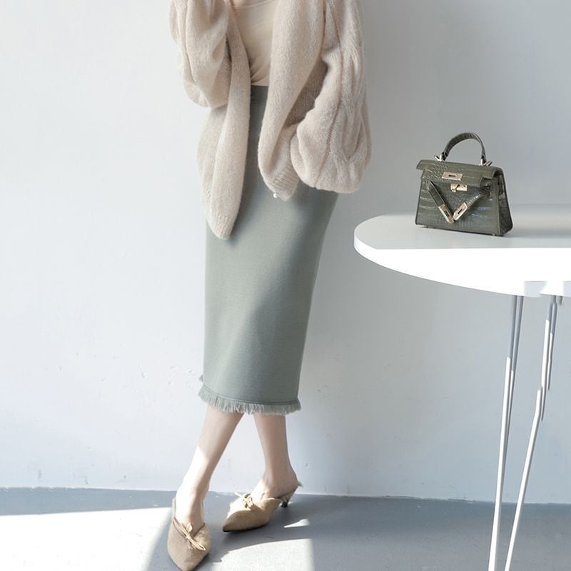 着用するだけでフェミニンな雰囲気が漂うハイウエストエレガントタッセルロングニットスカート。