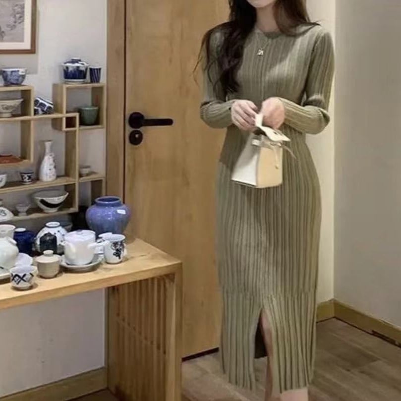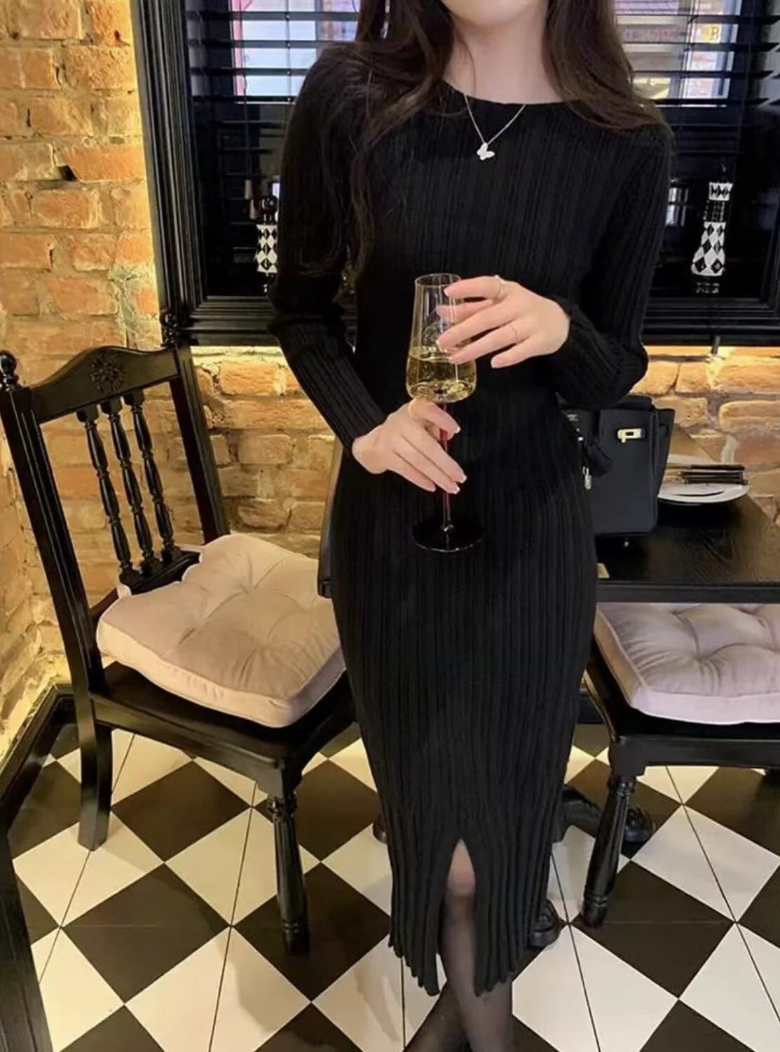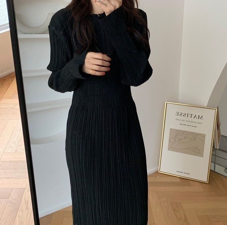 着用するだけでフェミニンな雰囲気が漂うラウンドネックエレガントプリーツデザインスリムニットドレス。
