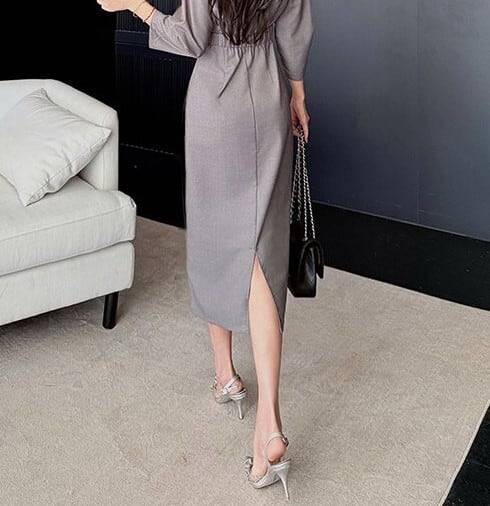 着用するだけでフェミニンな雰囲気が漂うポロカラーエレガントスリークオータースリーブスリムロングドレス。