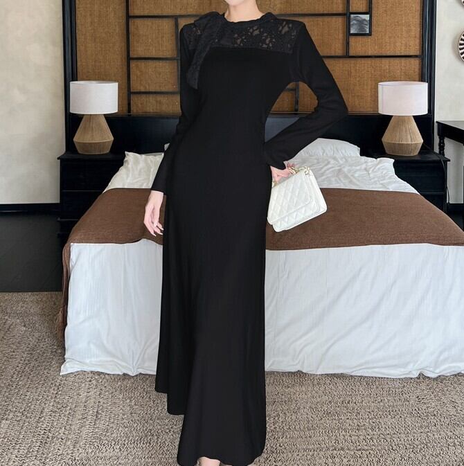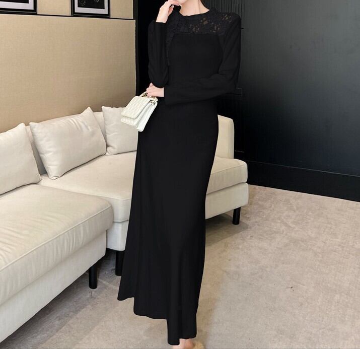 Chest ribbon elegant lace stitch long knit dress