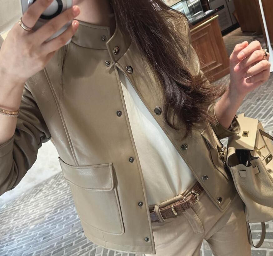 Stand collar elegant faux leather short jacket
