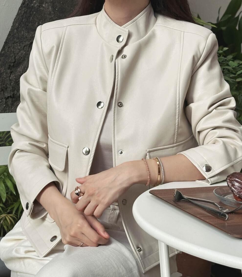 羽織るだけで大人可愛い雰囲気が漂うスタンドカラーエレガントフェイクレザーショートジャケット。
