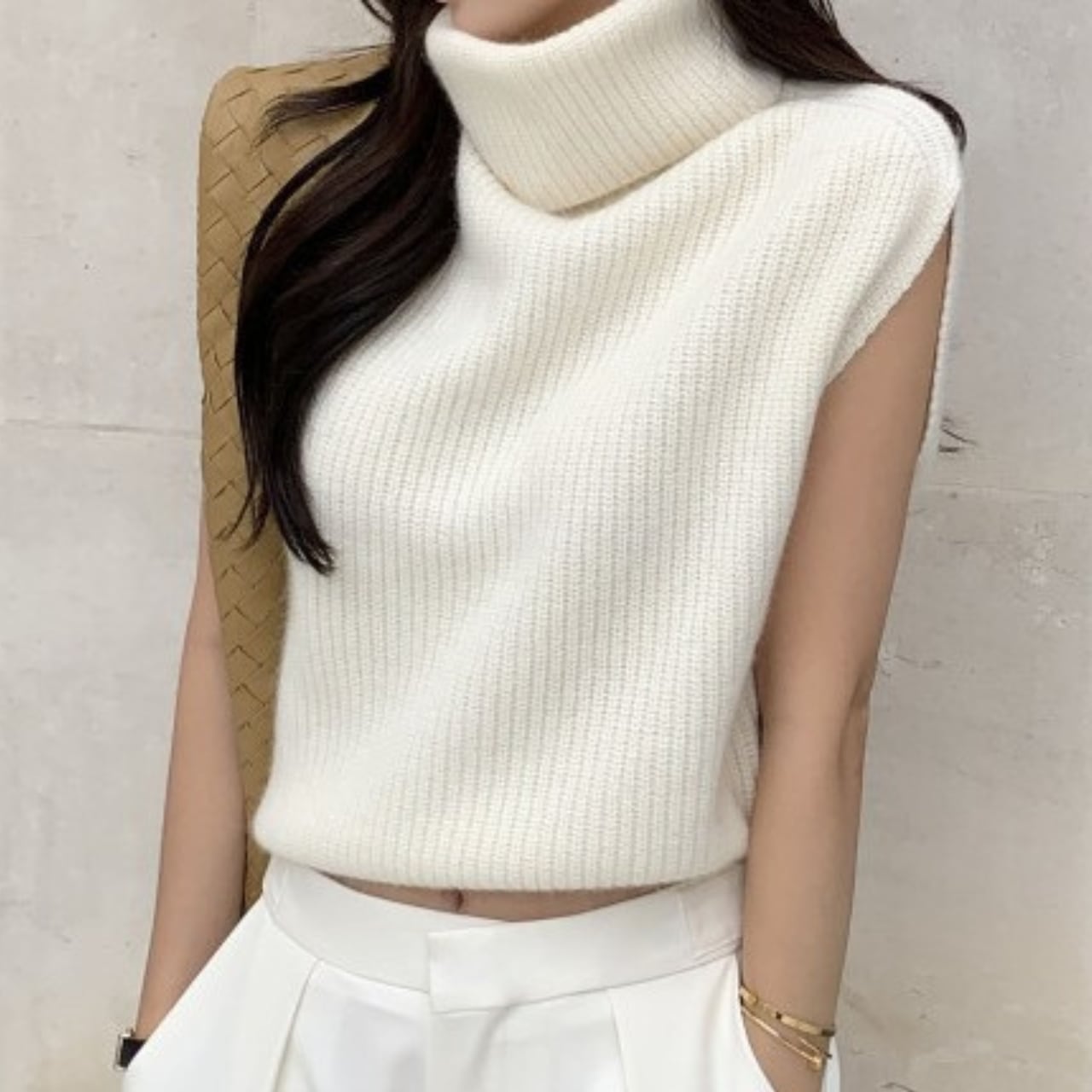 着用するだけで大人可愛い雰囲気が漂うハイネックエレガントスリーブレススリムニット。