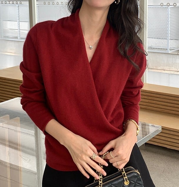 着用するだけで大人可愛い雰囲気が漂うクロスデザインエレガントスリムニット。