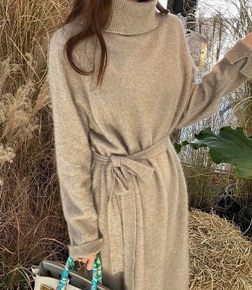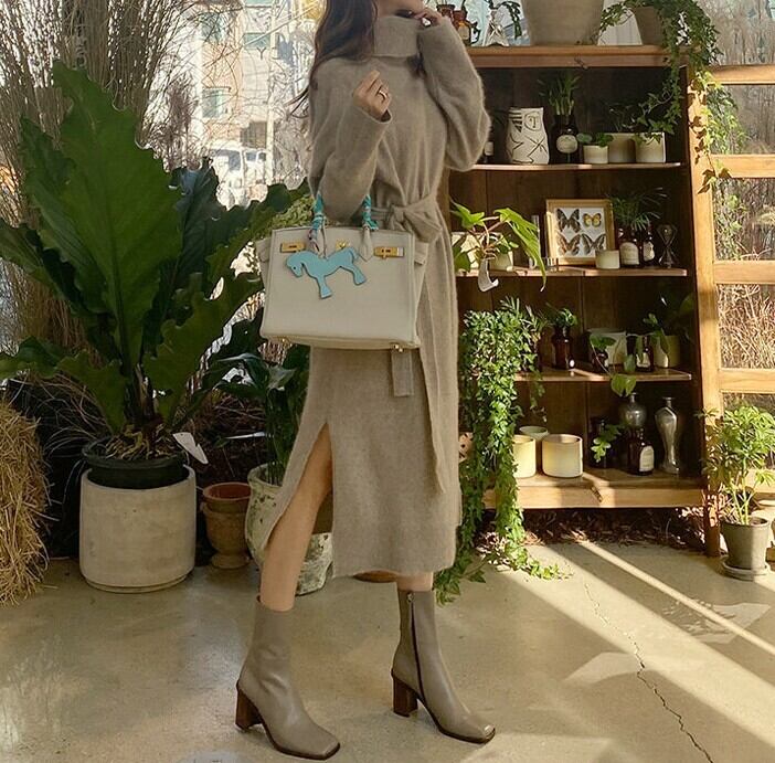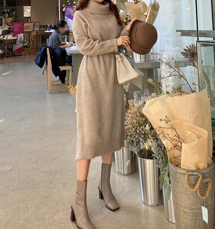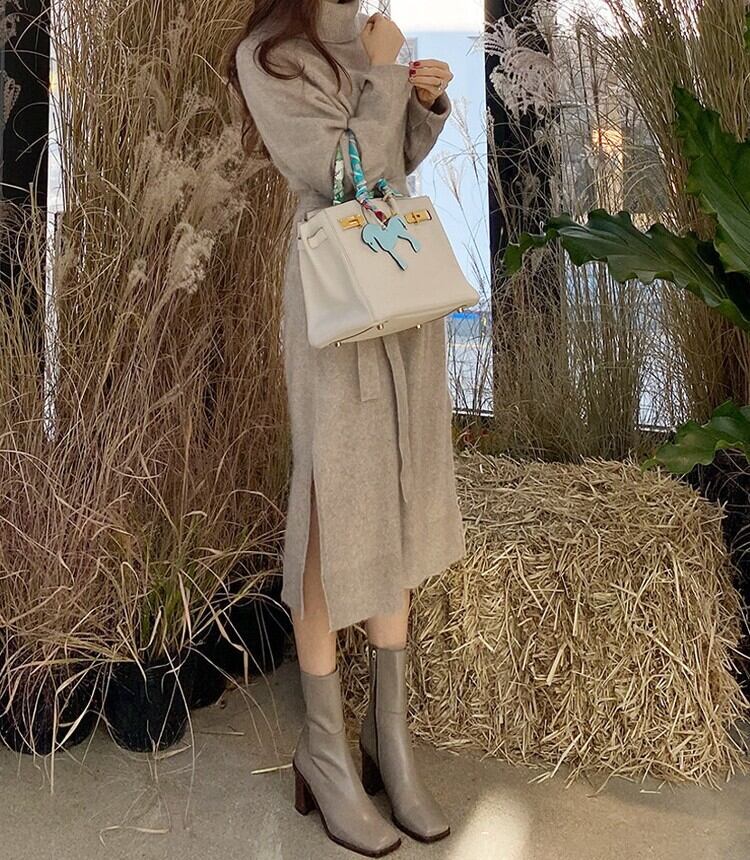 着用するだけでフェミニンな雰囲気が漂うハイネックエレガントサイドスリットストラップニットドレス。