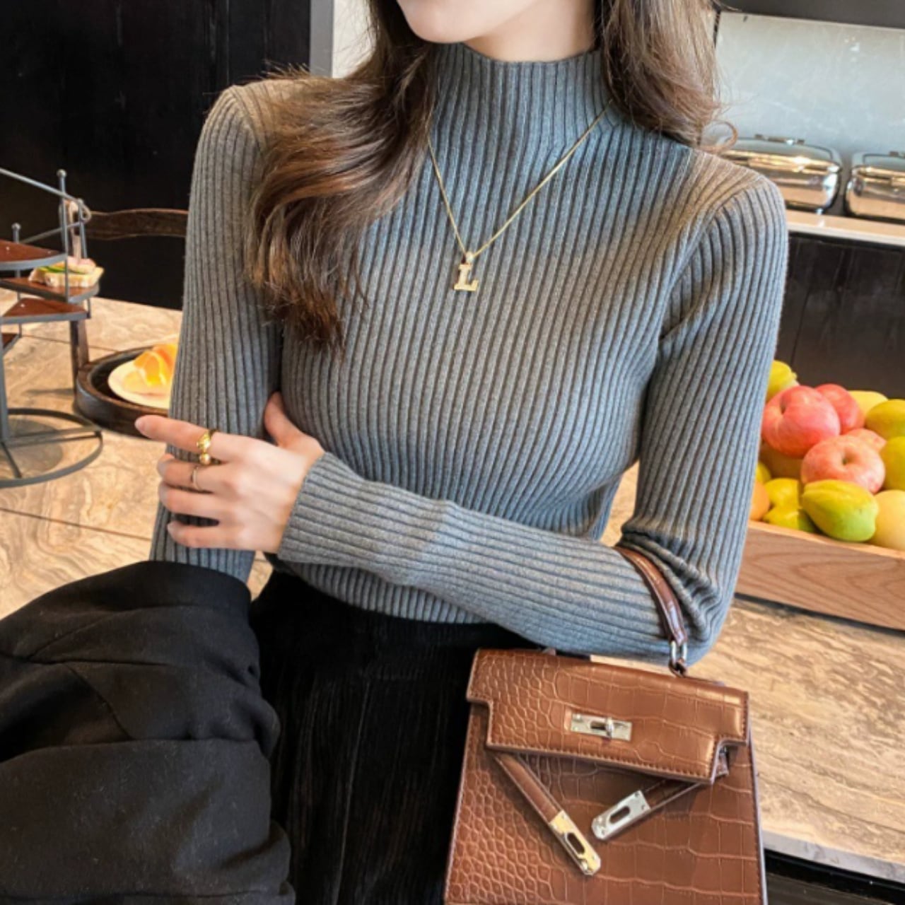 着用するだけでフェミニンな漂うハーフハイネックエレガントスリムフィットリブニット 。