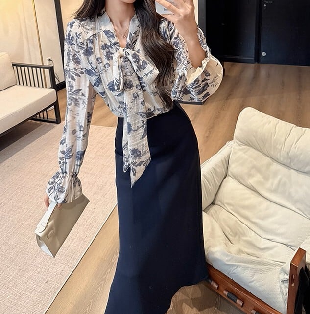チェストタイフレアスリーブシフォンシャツとハイウエストラージスイングロングスカートのセット商品です。
