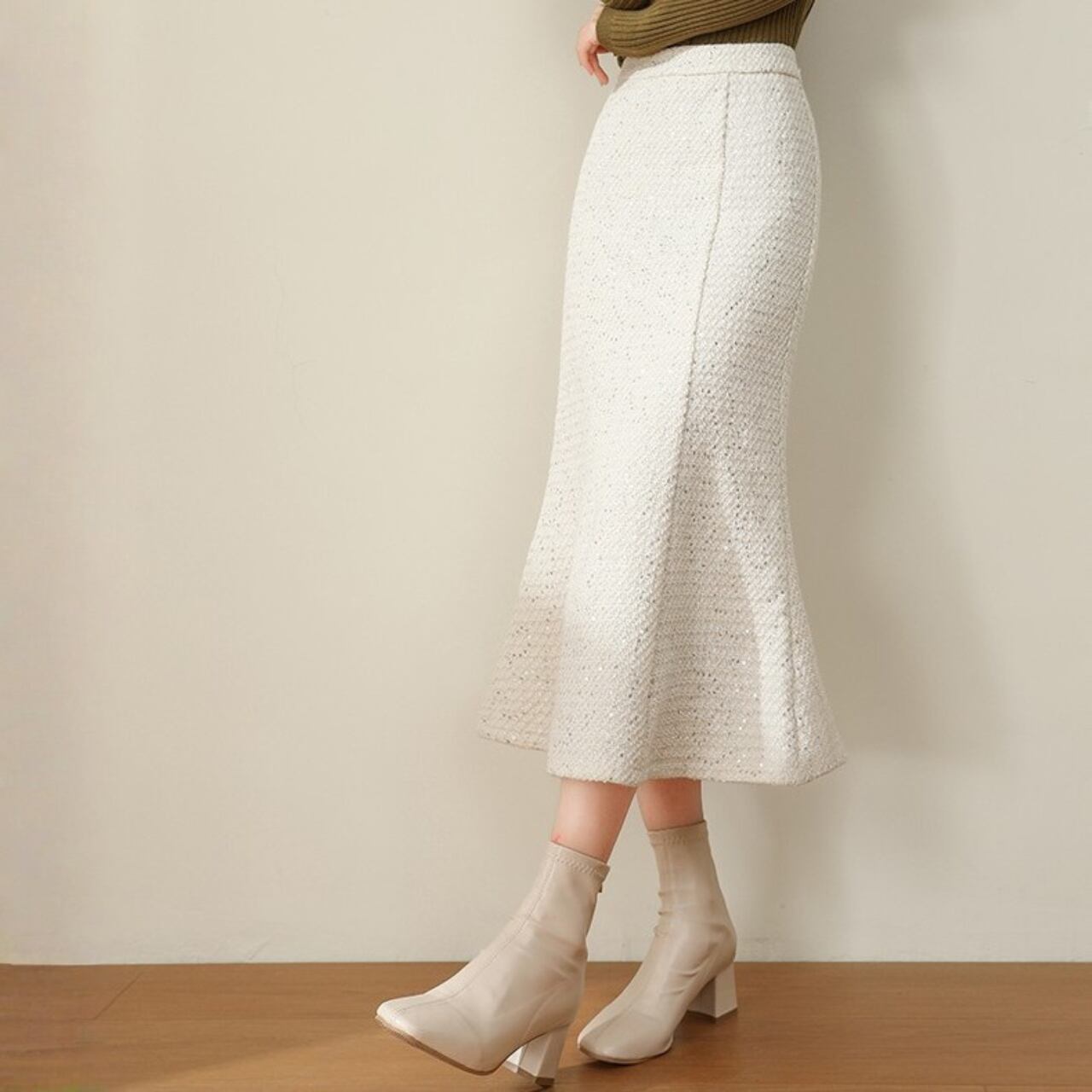 着用するだけでフェミニンな雰囲気が漂うハイウエストエレガントツイードマーメイドロングスカート。