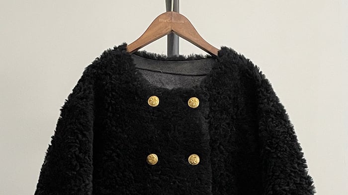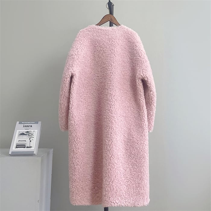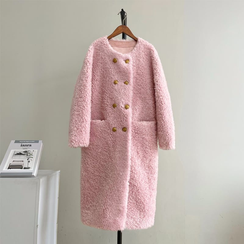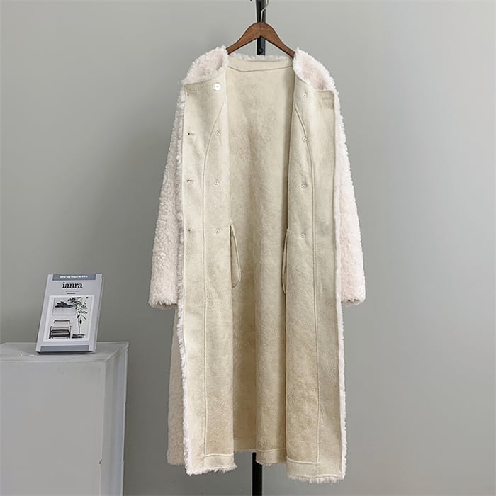 Collarless elegant double breast long lam wool coat