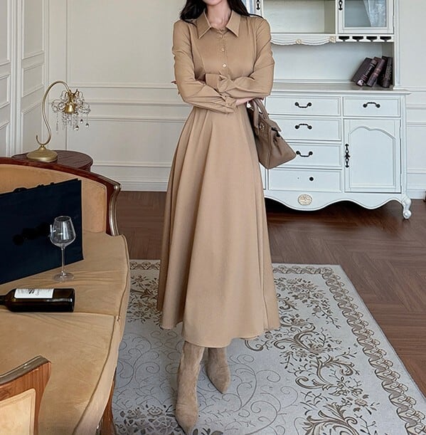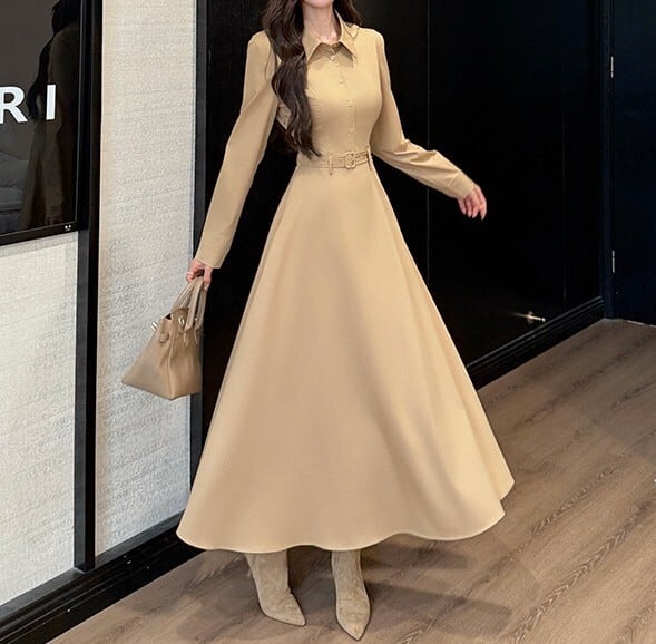 着用するだけでフェミニンな雰囲気が漂うラペルカラーエレガントラージスイングストラップロングドレス。