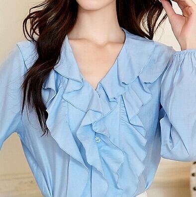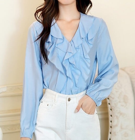 着用するだけでフェミニンな雰囲気が漂うVネックエレガントチェストラッフルシフォンシャツ。
