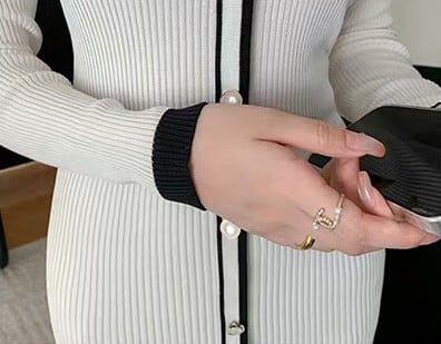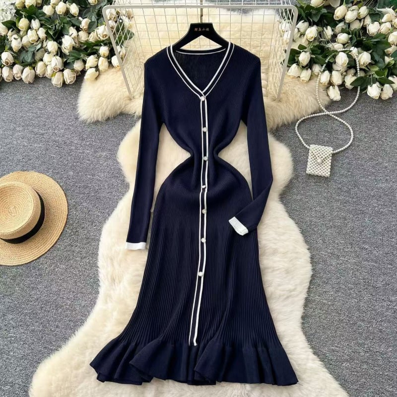 着用するだけでフェミニンな雰囲気が漂うシングルブレストエレガントヘムフレアスリムニットドレス。