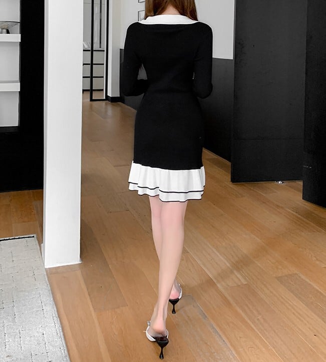 着用するだけでフェミニンな雰囲気が漂うラペルカラーエレガントラッフルステッチスリムニットドレス。