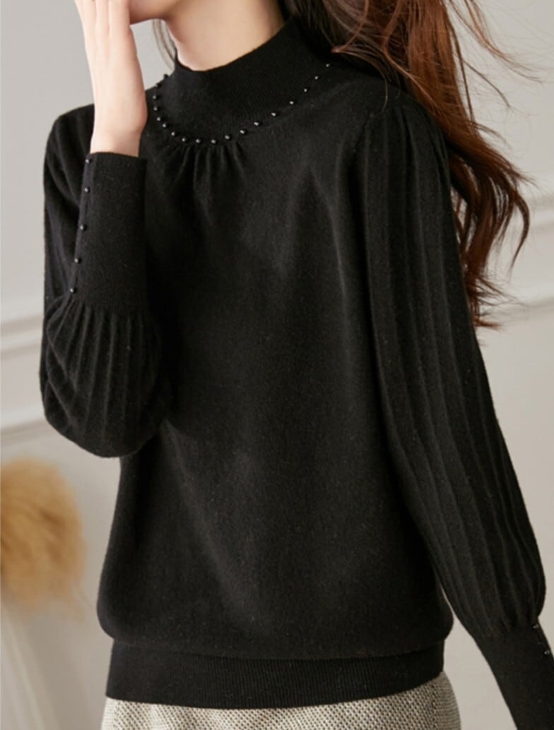 Half high neck elegant beads stitch slim knit ( 3color )