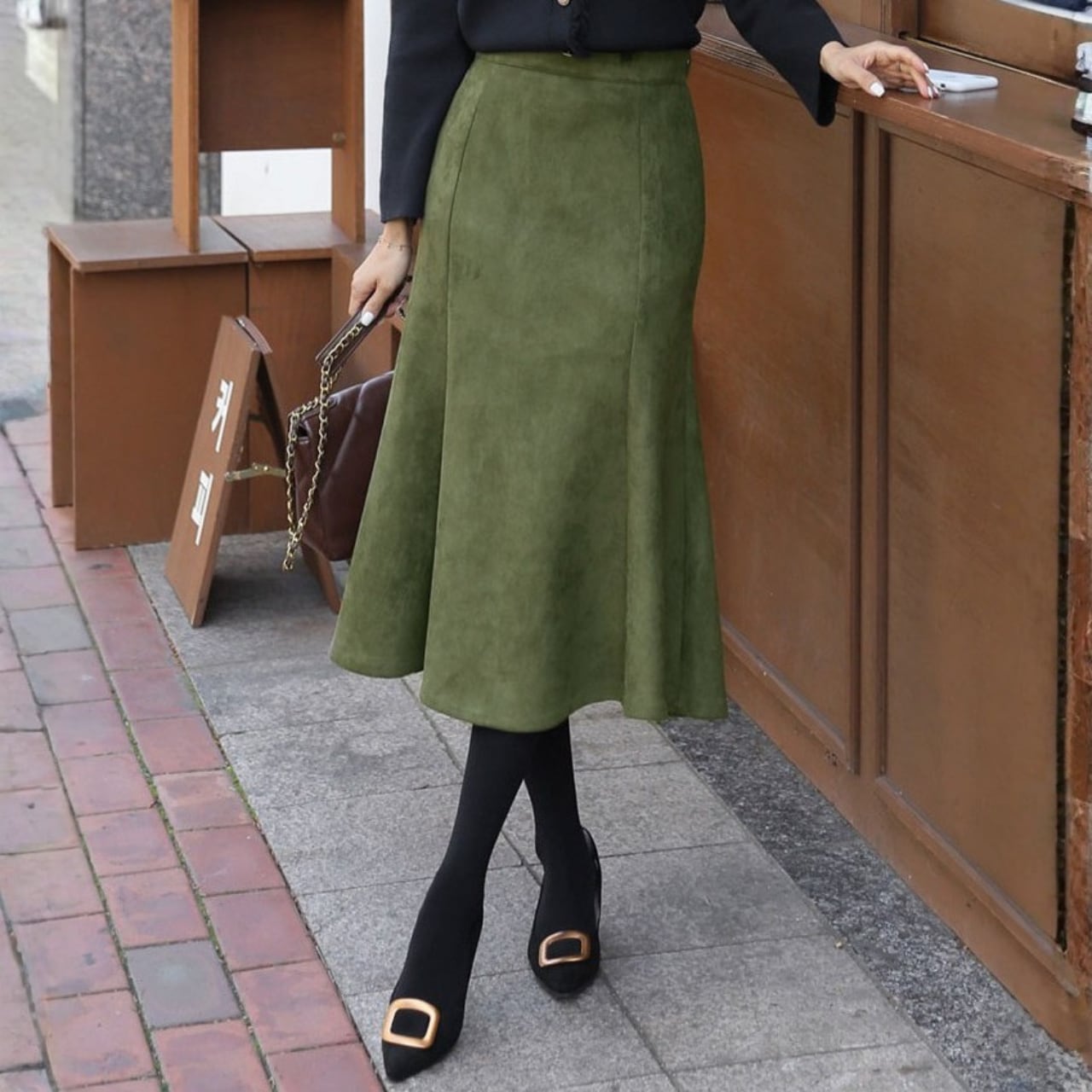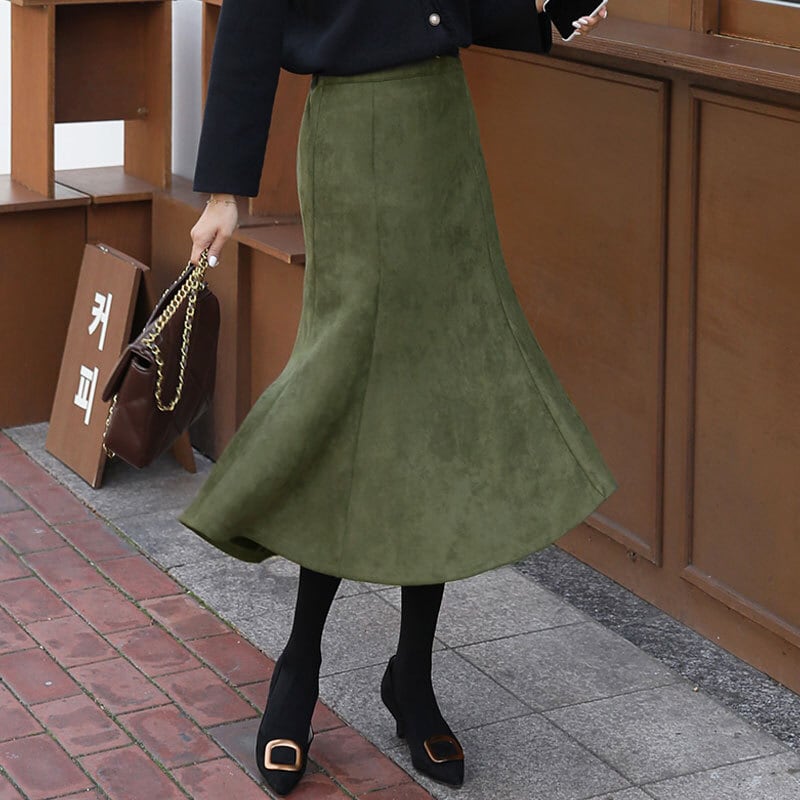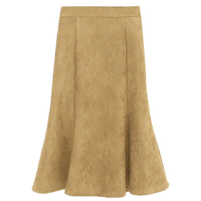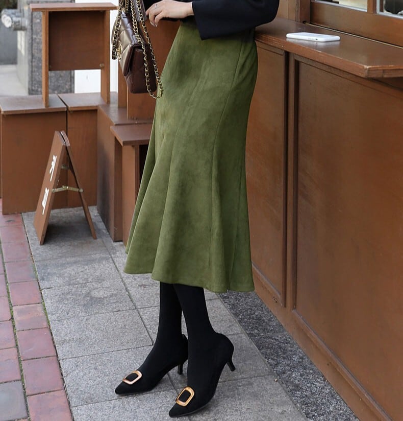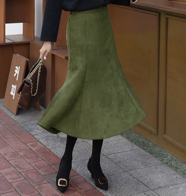 着用するだけでフェミニンな雰囲気が漂うハイウエストエレガントスイングスエードマーメイドスカート。