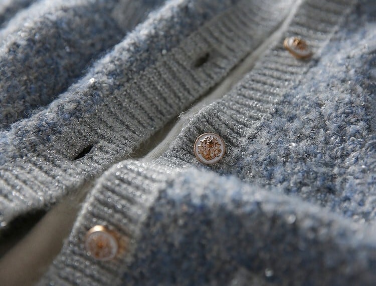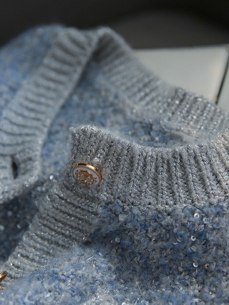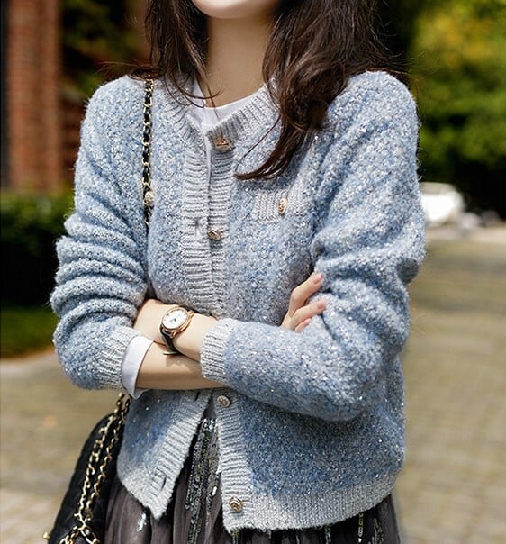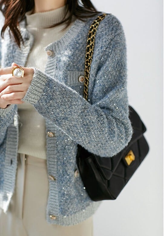 着用するだけでフェミニンな雰囲気が漂うシングルブレストエレガントスパンコールスリムニットカーディガン。