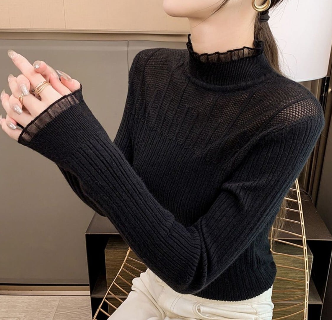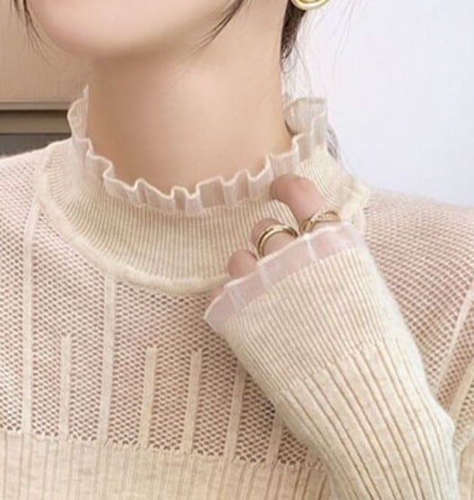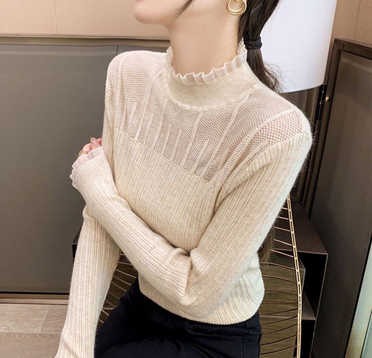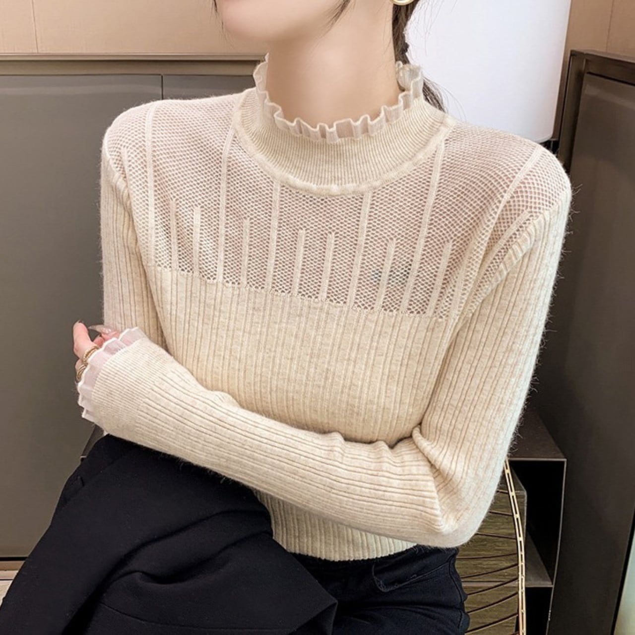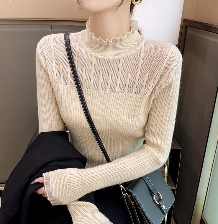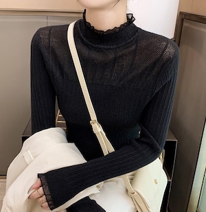 着用するだけで大人可愛い雰囲気が漂うハーフハイネックエレガントラッフルステッチチェストメッシュニット。