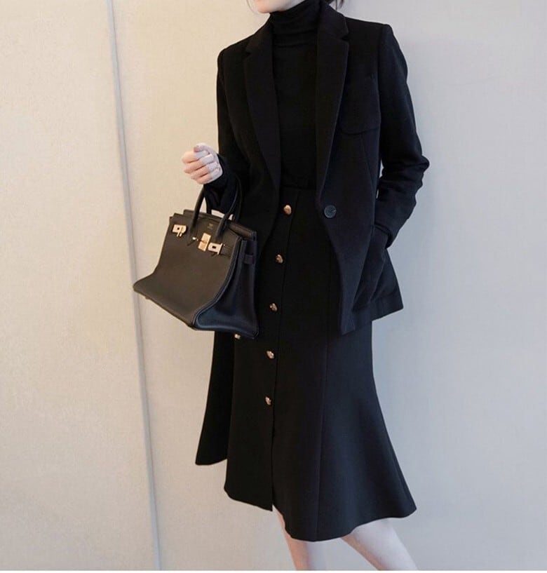 着用するだけでフェミニンな雰囲気が漂うハイウエストエレガントシングルブレストミドルマーメイドスカート。